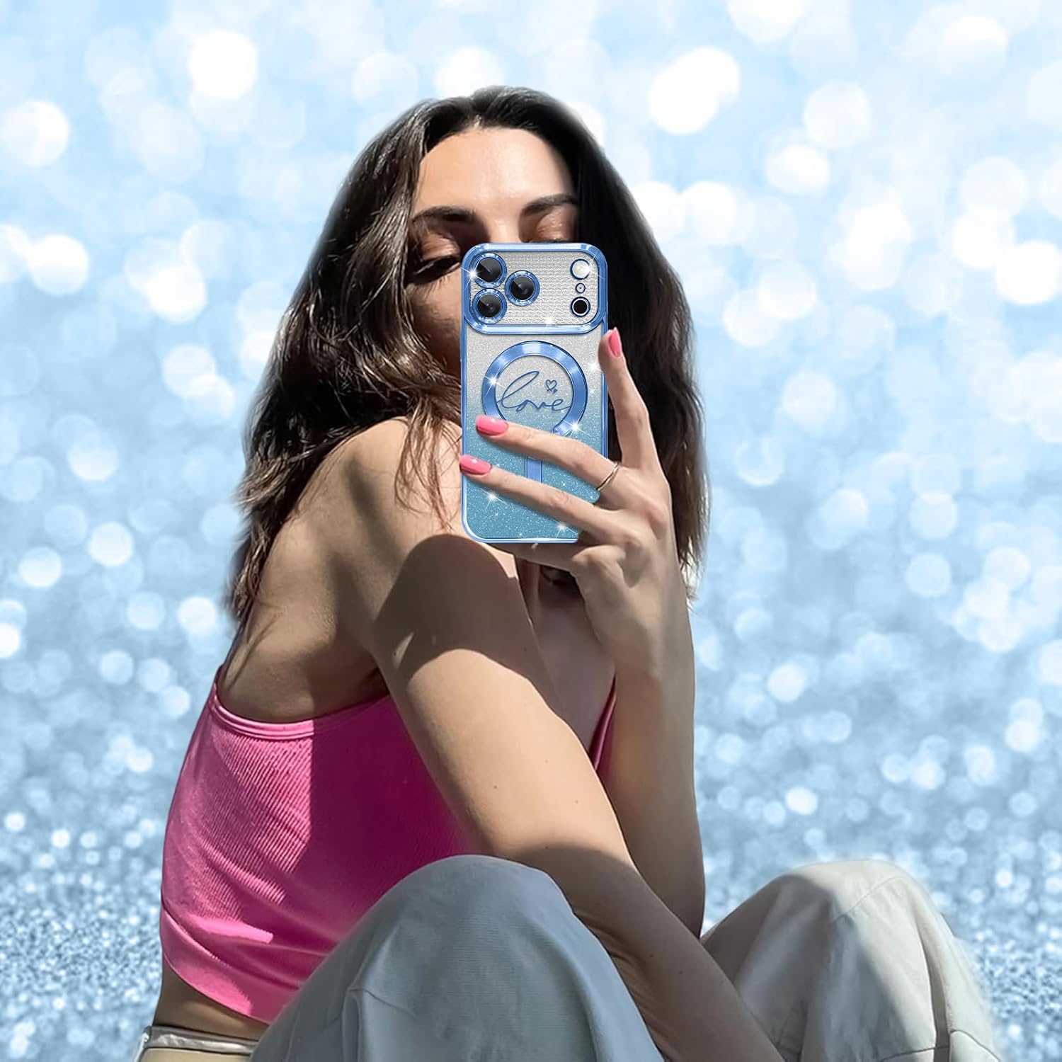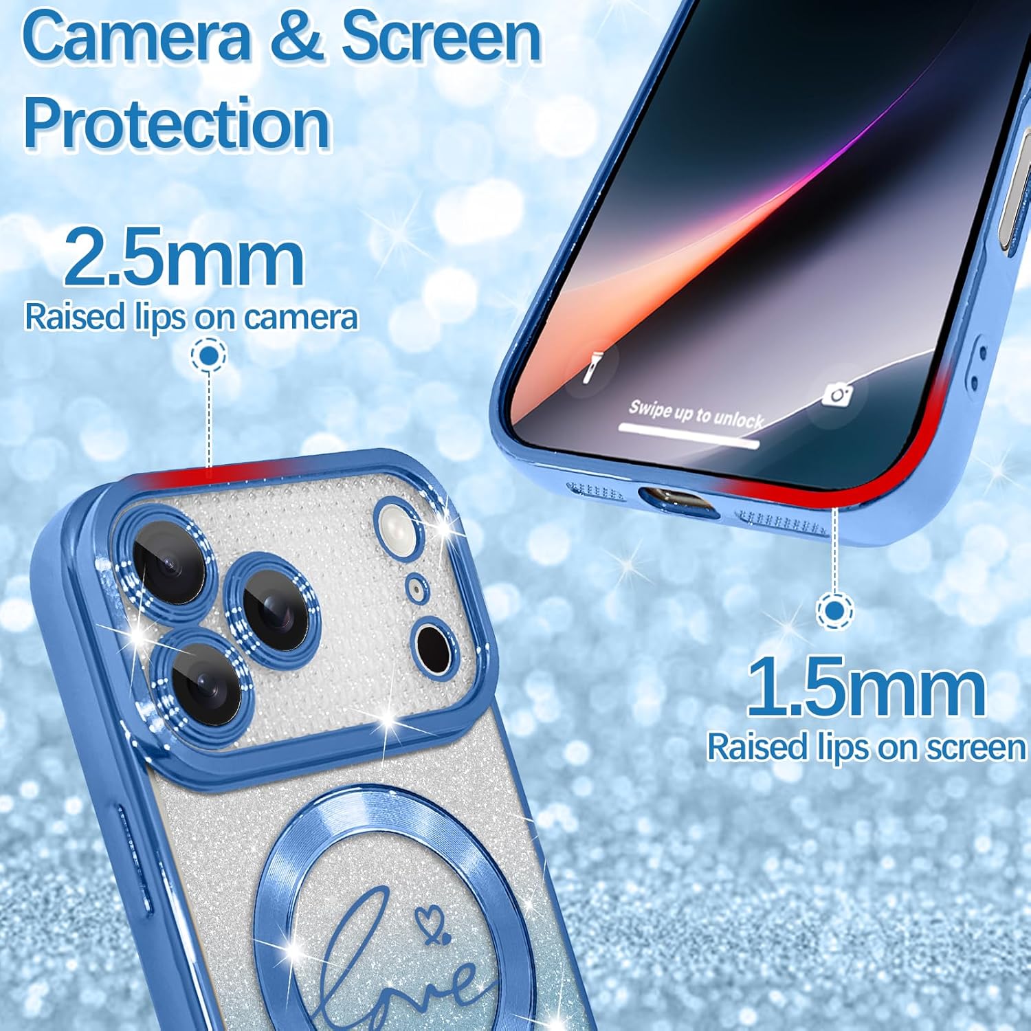 Made of soft materials,the 17 pro max glitter case-with love, heart patterns,is composed of transparent cover and glitter paper;the bling never fade,keeps sparkly and glamours,absolutely gorgeous