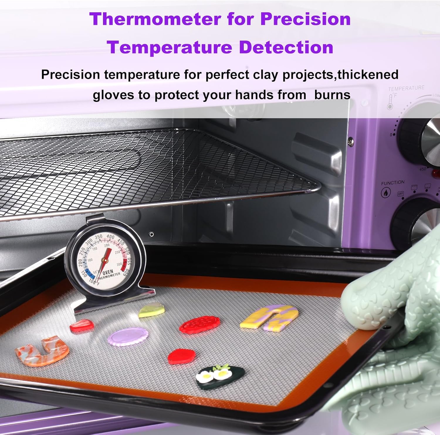 Meet your all-in-one solution for polymer clay artistry: This complete kit features a portable and safe oven with a heat-resistant shell, scald-proof handles, and easy knob temperature control. It comes with two heat-resistant gloves, an accurate oven thermometer, two non-stick silicone mats, a diamond-pattern baking grid for flatter results, and a sturdy tray to prevent slips—everything you need to bake multiple pieces perfectly and safely every time