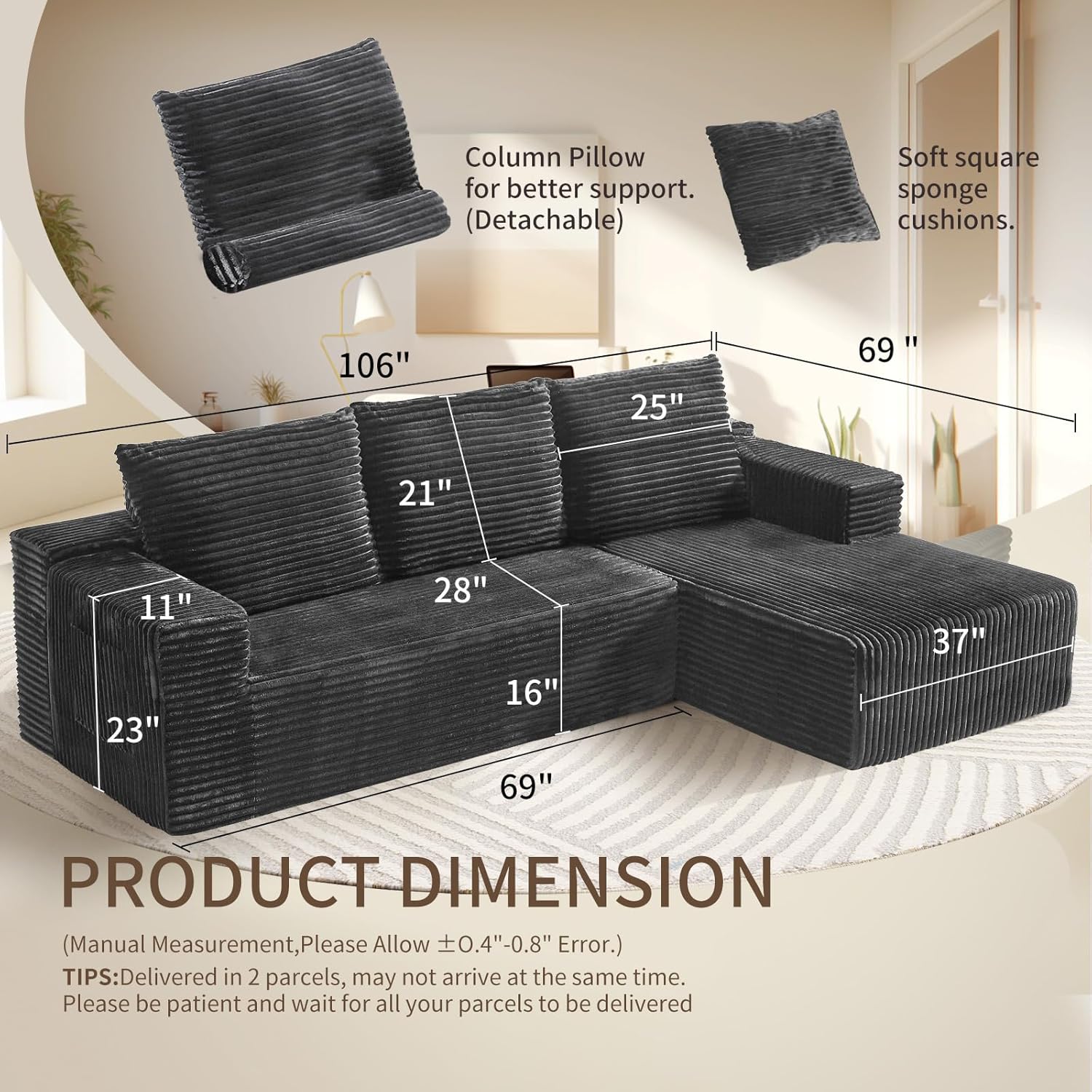 Luxurious Seating Experience: This L-shaped corduroy couch is suitable for everyone. Ergonomics is the key element when designing a sectional sofa. Enhanced backrests and armrests provide more support to the body and space for storage. This modular sectional couch has generous 28” deep seats and is paired with a 57” long chaise lounge, which can turn into a relaxed sofa bed.