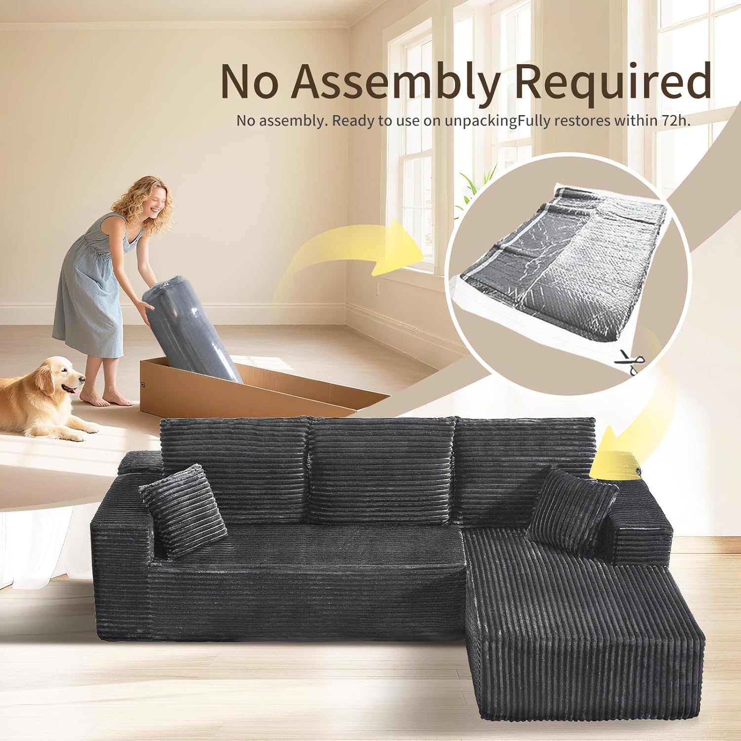 106'' Cloud Sectional Couch with L-Shape Chaise, Boneless Modular Sofa with Deep Seat, Modern Corduroy Couch for Living Room, No Assembly Required. (Grey, Right-Facing Chaise)