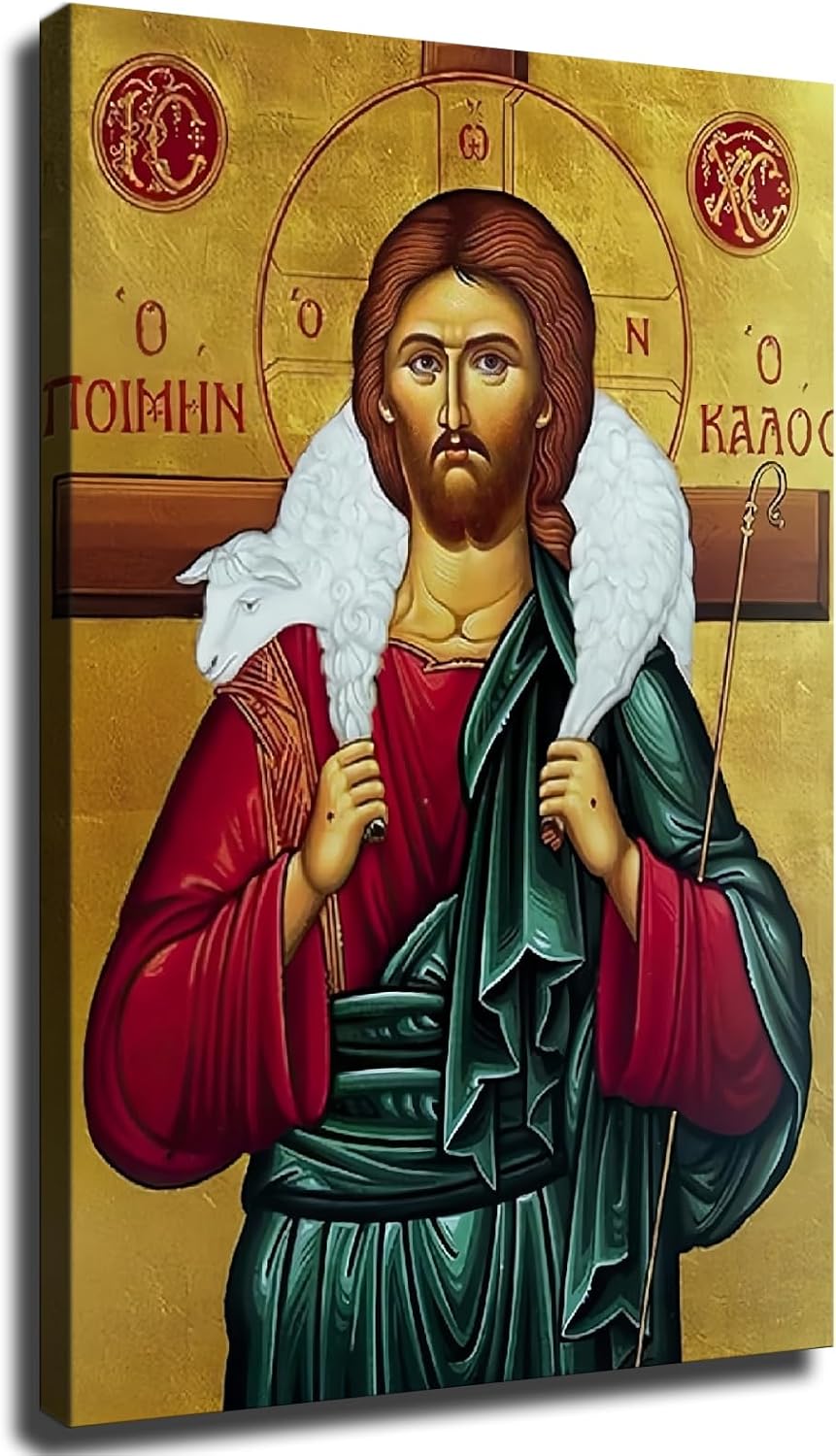 Jesus Christ Icon The Good Shepherd Wall Art, Greek Orthodox Icon Byzantine Icon Posters, Vintage Oil Painting Style Wall Decor, For Living Room Bedroom Decoration (Framed,08 * 12inch)