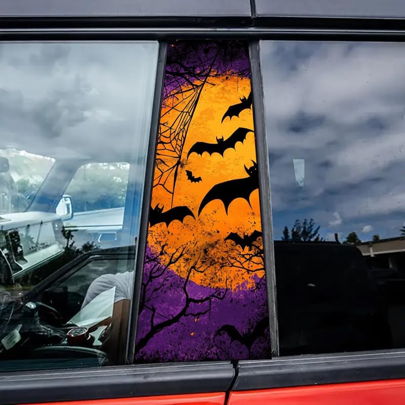 B-PILLAR STICKER DECAL: Upgrade your car, Halloween car decal design with pumpkins, bats and other classic elements, vivid and funny, full of scary Halloween spirit, improve the appearance of your car with eye-catching B-pillar decal, make your car stand out in the garage or car-heavy places.
