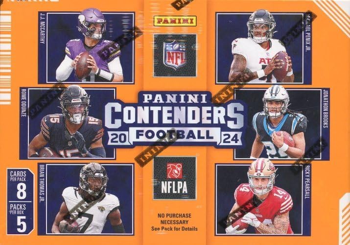 We are Proud to offer this 2024 Panini Contenders Football EXCLUSIVE Factory Sealed Blaster Box! This EXCLUSIVE Factory Sealed Blaster Box Includes 5 Packs with 8 Cards per Pack Including One Autograph or Autograph and (7) Inserts or Parallels, on average! The juggernaut that is Contenders Football returns for the 2024 season, boasting its trademark arsenal of collection-making content headlined by Rookie Ticket autographs, a spectacular array of parallels, must-have inserts and so much more. Look for Exclusive Parallels - Blue parallels for Game Ticket, Draft Class Contenders, Historic Draft Class Contenders, Round Numbers and Rookie Stallions! Look for ultra-rare inserts including Permit to Dominate, Superstar Die-Cuts and more! Look for Rookies & Autographs of the highly sought-after 2024 NFL Draft Class including Jayden Daniels, Marvin Harrison Jr., Bo Nix, Caleb Williams, Malik Nabers, Rome Odunze, Brian Thomas Jr., Drake Maye, J.J. McCarthy, Brock Bowers, Michael Penix Jr., Xavier Worthy & Many More! This Product is Loaded! Good Luck with your Pulls!