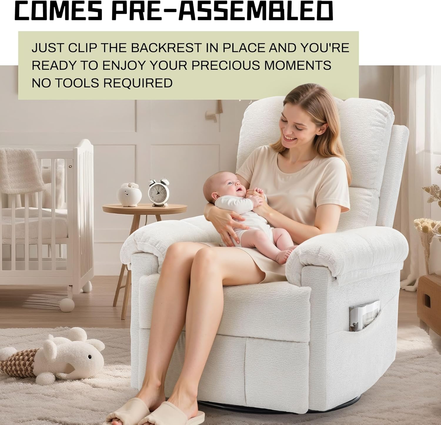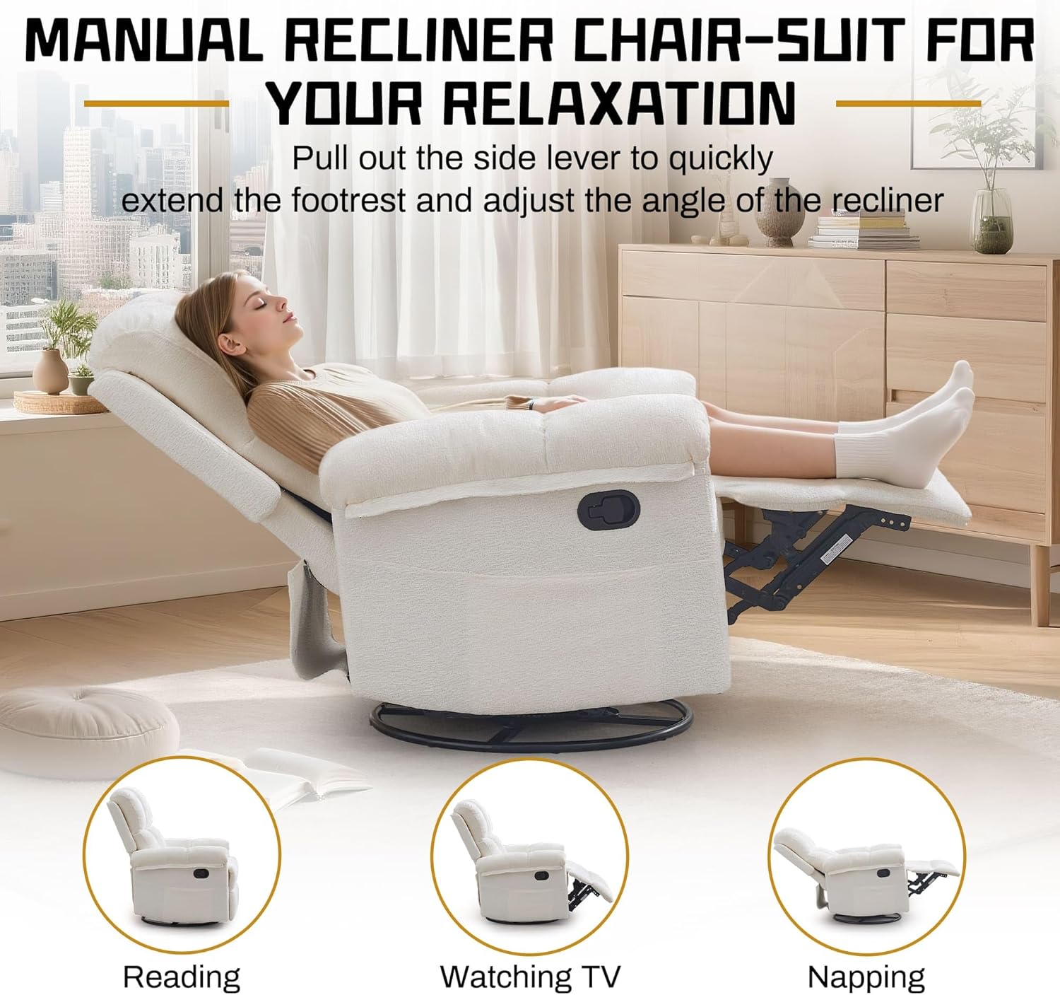 Spin & Sink In: Easily swivel 360° to face the TV, chat with family, or enjoy the view, while the gentle rocking relieves your stress. When it's time to relax, easily pull the lever and the footrest opens smoothly. The backrest can be adjusted from 120-150° to ideally fit your comfortable position. Whether you want to enjoy a movie night, enjoy a good book, or just enjoy a rare "me time" on the weekend, the glider recliner chair can adapt to your needs seamlessly and let you enjoy the comfort.