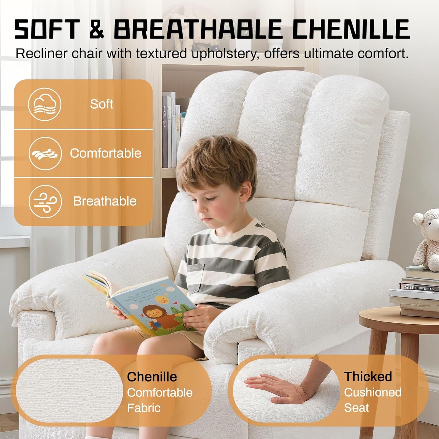 Cloud-like Comfort: The glider chair is made of high-quality chenille, with a soft and skin-friendly short plush texture. Not only does the chair look like marshmallows or clouds, but the high-resilience sponge seat and thickened armrests also offer cloud-like support and are not easily deformed. The thoughtful side pocket allows you to easily access your needs. Whether you want to enjoy reading time, take a nap in the afternoon, or watch a movie leisurely at night, the cute chair is worthwhile.