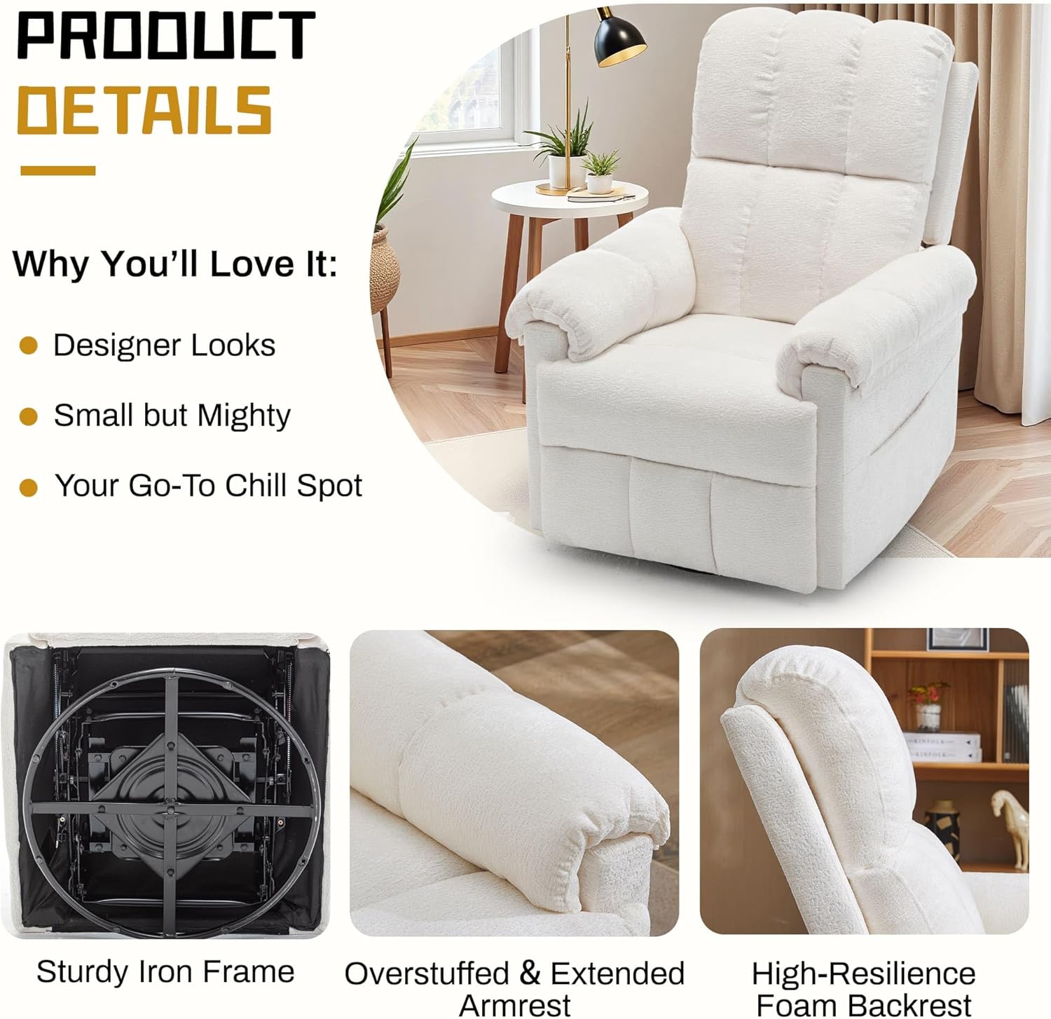 Built to Last: The small premium recliner features a solid wood frame and reinforced iron construction for durability and supports up to 330 lbs. Whether you sit upright or recline, you'll get stable support and dependable comfort. Sink in, close your eyes, and enjoy complete tranquility as the sturdy design allows you to spend every relaxing moment, from an afternoon read to a restful nap. More than just a piece of furniture, it's your everyday retreat, designed for lasting comfort and safety.
