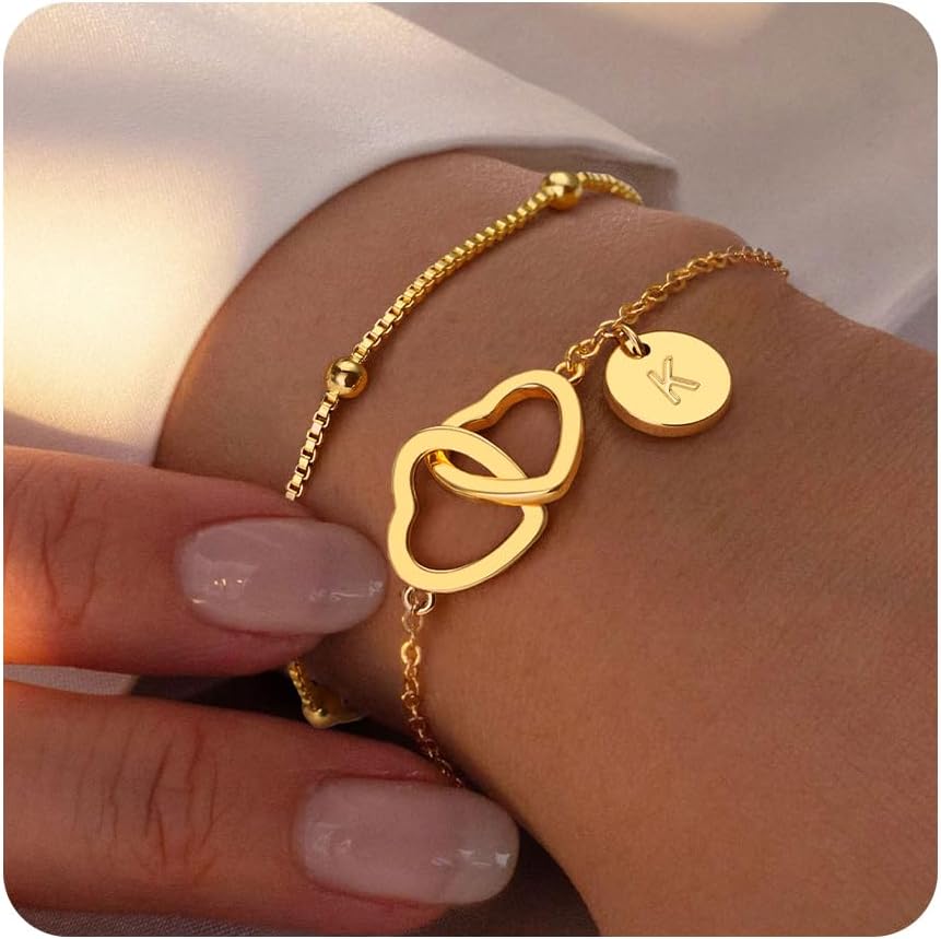 M MOOHAM Initial Bracelets for Women, Dainty Disc Initial A-Z Bracelet Jewelry, Satellite Chain Double Hearts Bracelets, Birthday Gifts for Women Mom Daughter Friend