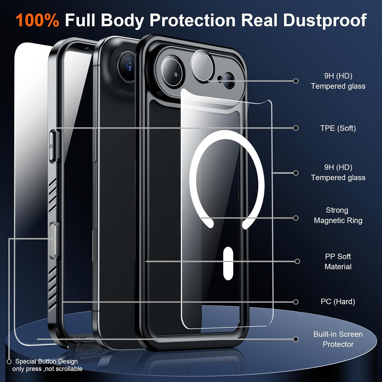 SPIDERCASE Magnetic for iPhone Air Case Waterproof, Built-in Lens & Screen Protector,[IP68 Underwater][15FT Military Shockproof] [Dustproof] Full Body Protection Cover for iPhone 17 Air 6.5’’,Black