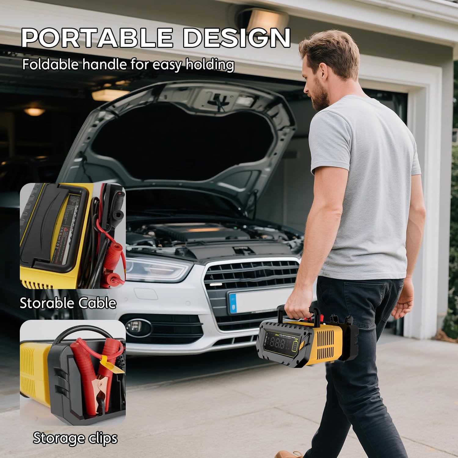🚙🆗Foldable and Portable Design: The top portable handle design and bottom bracket of the charger, they can be folded for easy carrying storage and using. The unique design on the back of the charger allows you to wrap and store messy power cords, and the clips on the both sides can also be clipped, which makes your charger no longer messy.