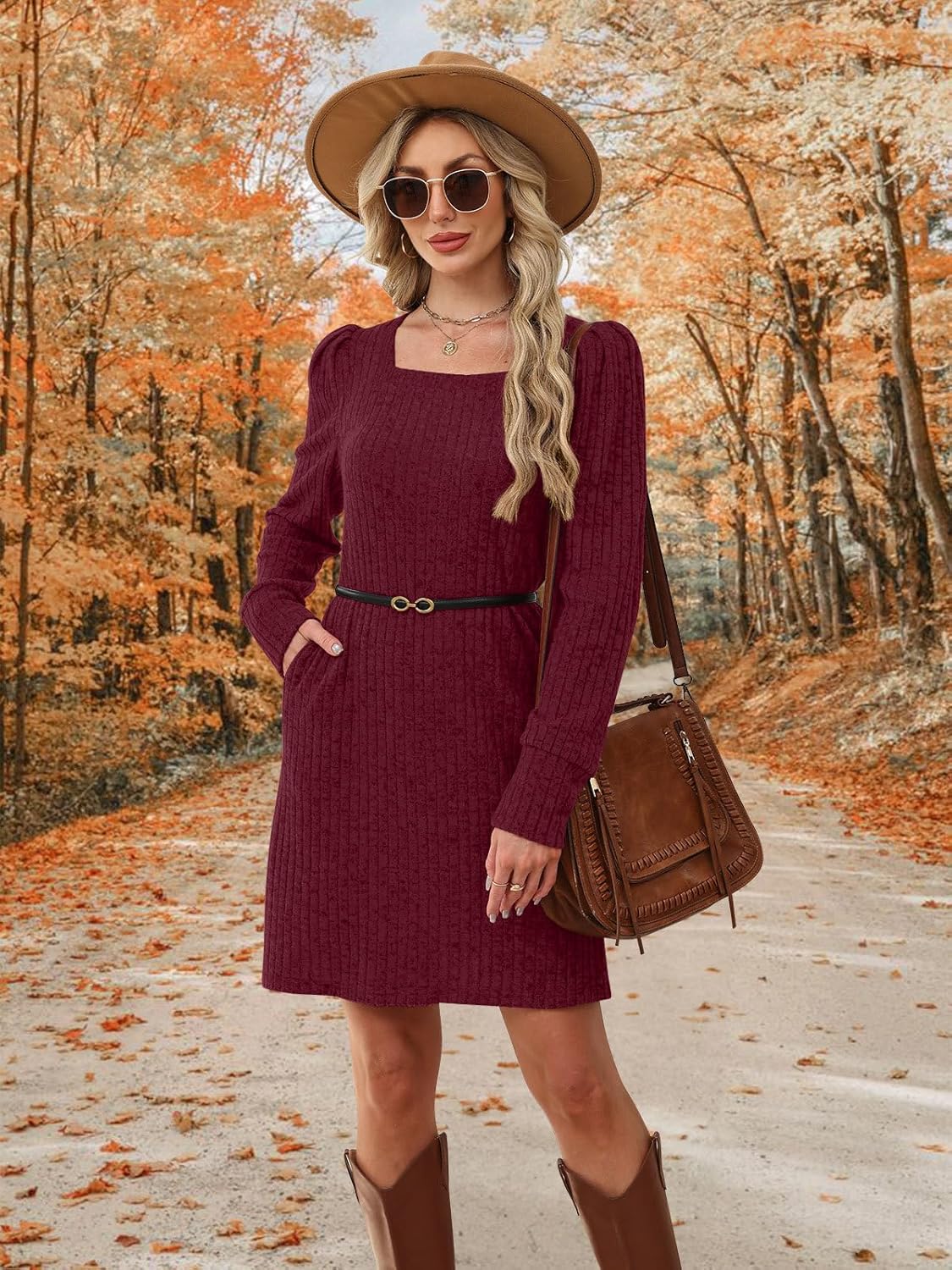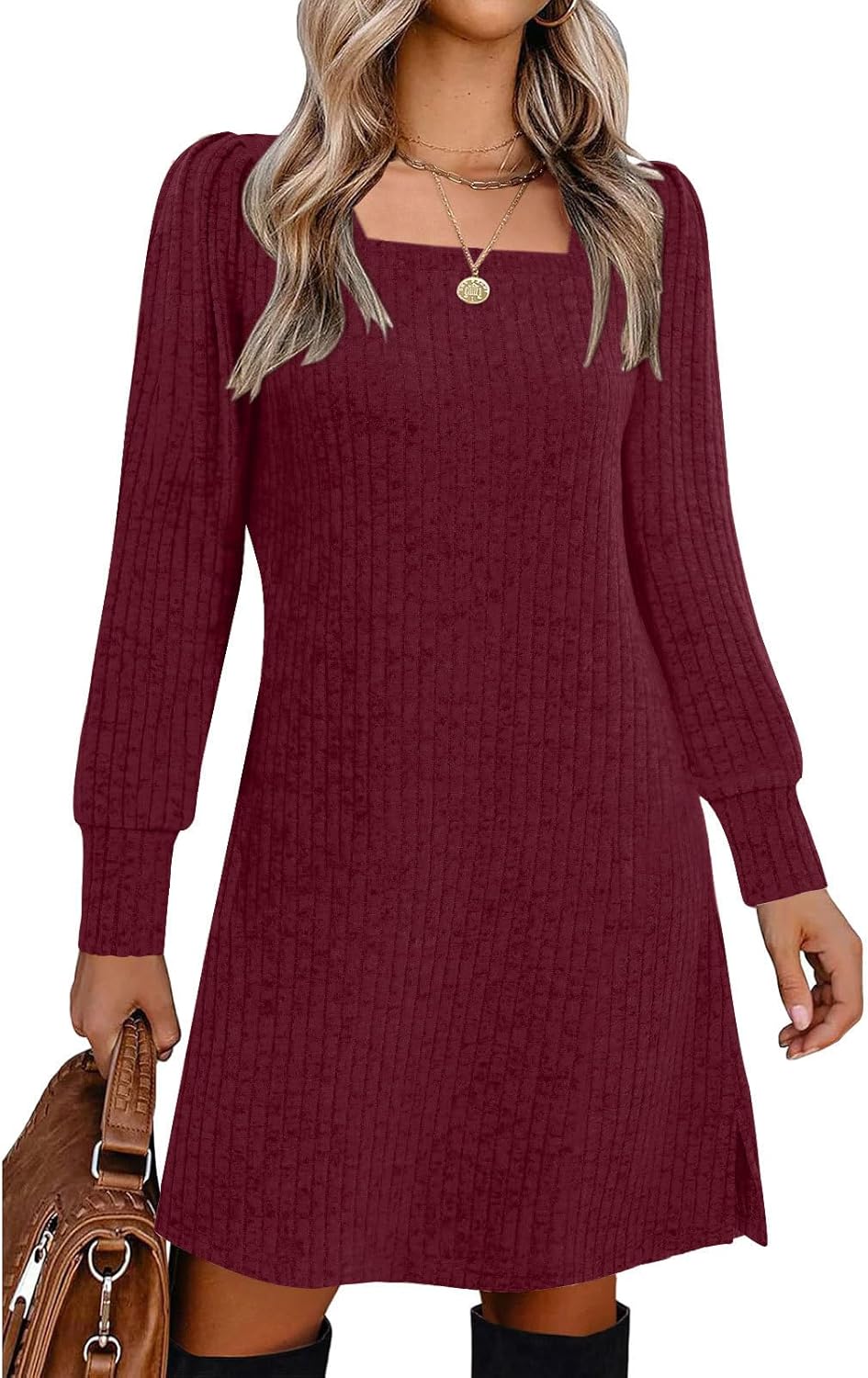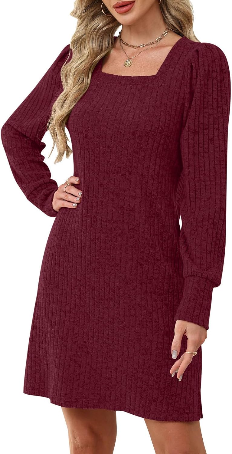 Womens Ribbed Knit Sweater Dress Long Sleeve Square Neck Fall Winter Dresses