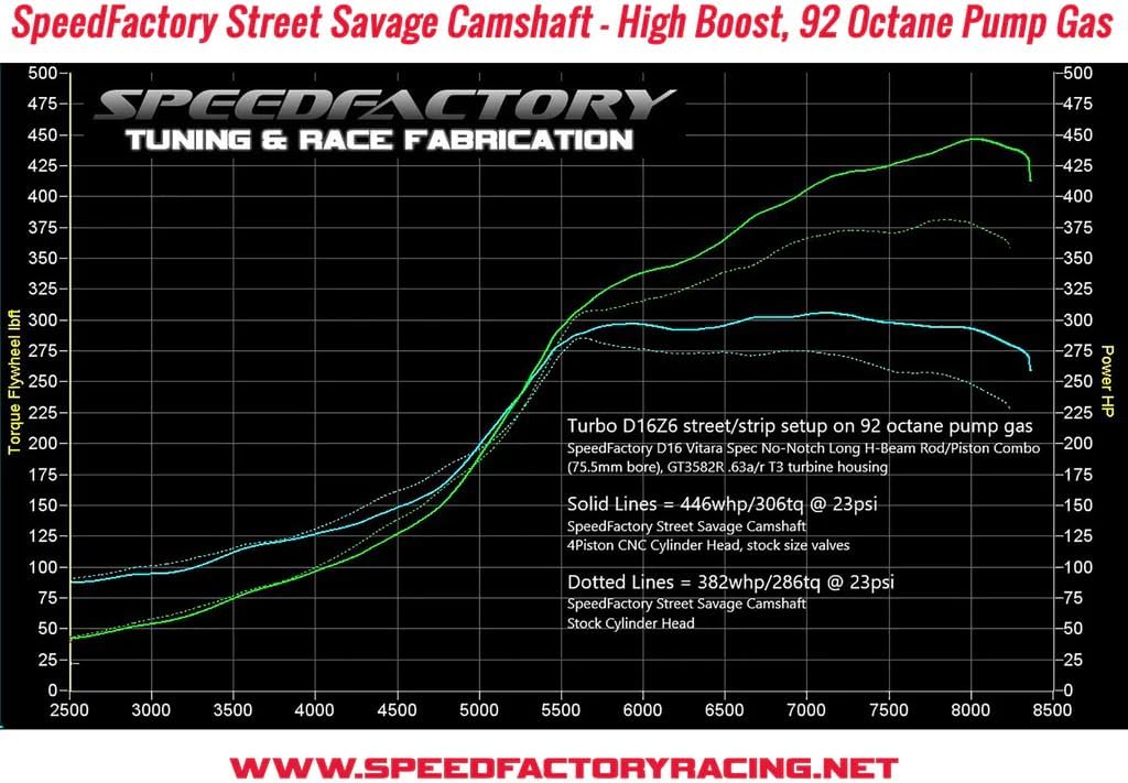 SpeedFactory Racing D16 SOHC VTEC Street Savage Camshaft Fitment: D15/D16 SOHC VTEC engines (D16Z6, D16Y8, JDM D15B SOHC VTEC, SOHC VTEC ZC) We proudly released the ideal camshaft for all you street/strip turbo D16 guys out there! After testing many different D16 SOHC VTEC camshafts over the years, we have found there was almost always a sacrifice at some point. Poor idle quality, loss of low rpm and/or midrange power, slower spool, and inefficiencies at certain high rpm ranges were all commonplace in most cams we tested. We set out to create the ideal street/strip turbo cam. One that has smooth stock idle quality & vacuum levels and provides increases in power across the board, from off idle to redline with faster spool and no sacrifice anywhere in the powerband. The new SpeedFactory Racing D16 SOHC VTEC Street Savage Camshaft is the result. +60whp/+22tq gains over the stock camshaft were found in comparison testing at the same boost level on a typical turbo D16Z6 Vitara build setup, and 446whp/306tq was achieved on an optimized pump gas Vitara build. Product Features: Street/strip turbo duty Excellent idle quality, faster spool, and increased midrange & top end power SpeedFactory Racing camshafts are designed and manufactured using new chill-cast blanks for superior wear characteristics and to eliminate any possible issues with post heat treatments etc. Product Notes: Aftermarket cam gear is required for installation. Upgraded valve springs are required.