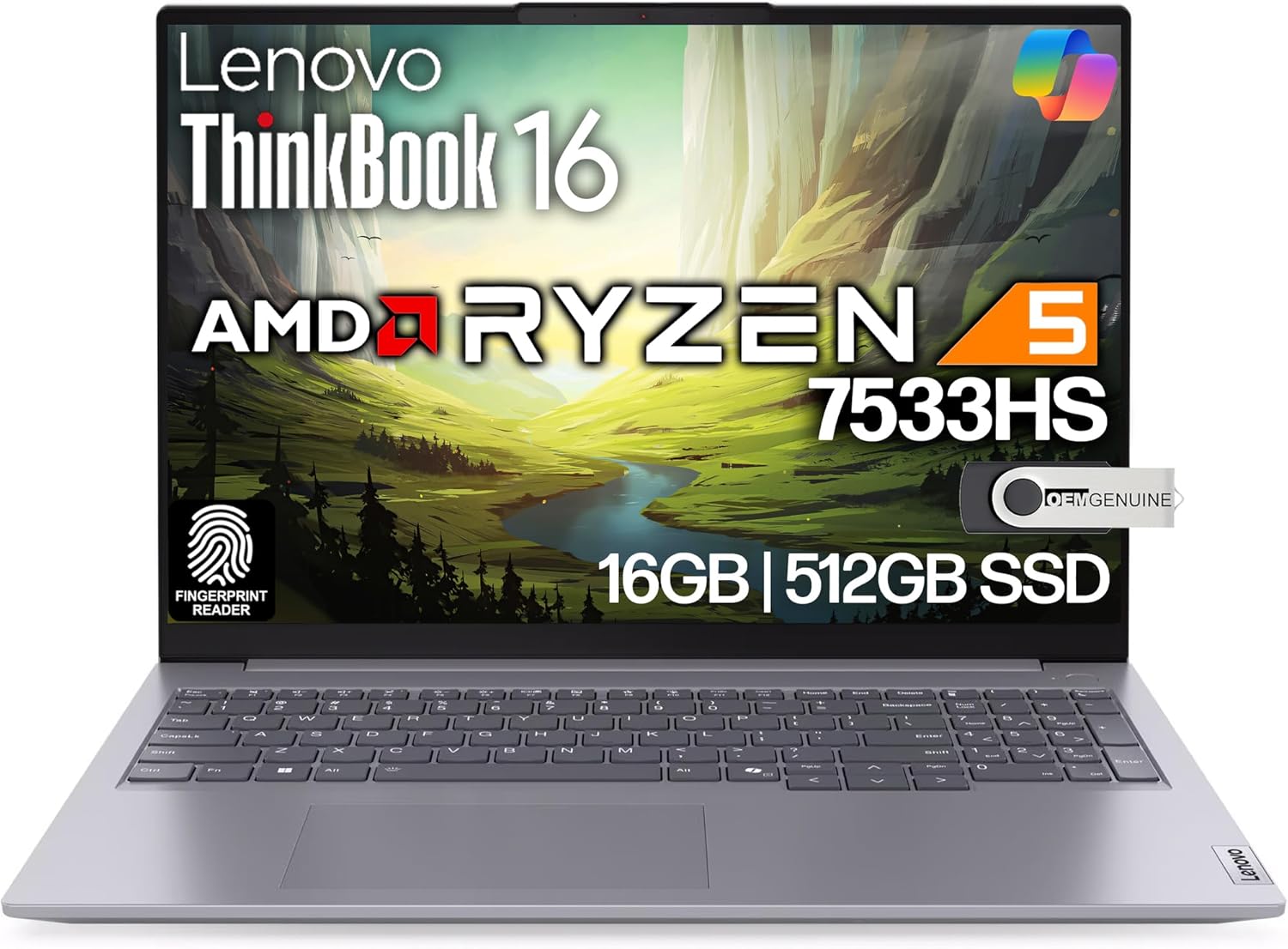 Lenovo ThinkBook 16 G7 Business Laptop, 16” FHD+, AMD Ryzen 5 7533HS, 16GB DDR5, 512GB NVMe, WiFi 6 + BT, RJ-45, HDMI, Fingerprint Reader, HD Webcam, Win 11 Pro