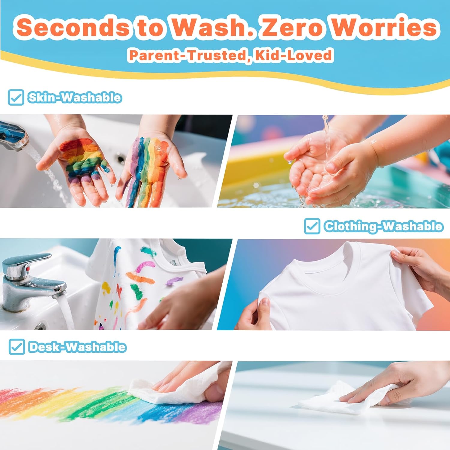 🌱 Non-Toxic & Super Washable - For Worry-Free Play! Made with safe, odorless materials (ASTM D-4236 certified), these crayons wash off skin, clothes, and walls in seconds. Let creativity run wild and enjoy true peace of mind with every mess-free masterpiece