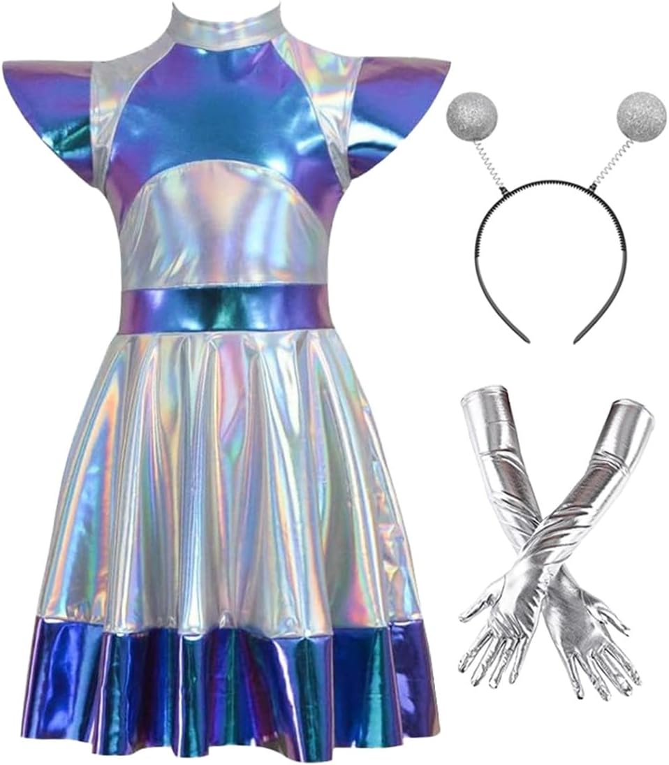 3 Pcs Women Alien Costume Metaillic Dress Cosplay Halloween Robot Outer Space Outfit With Gloves Headband