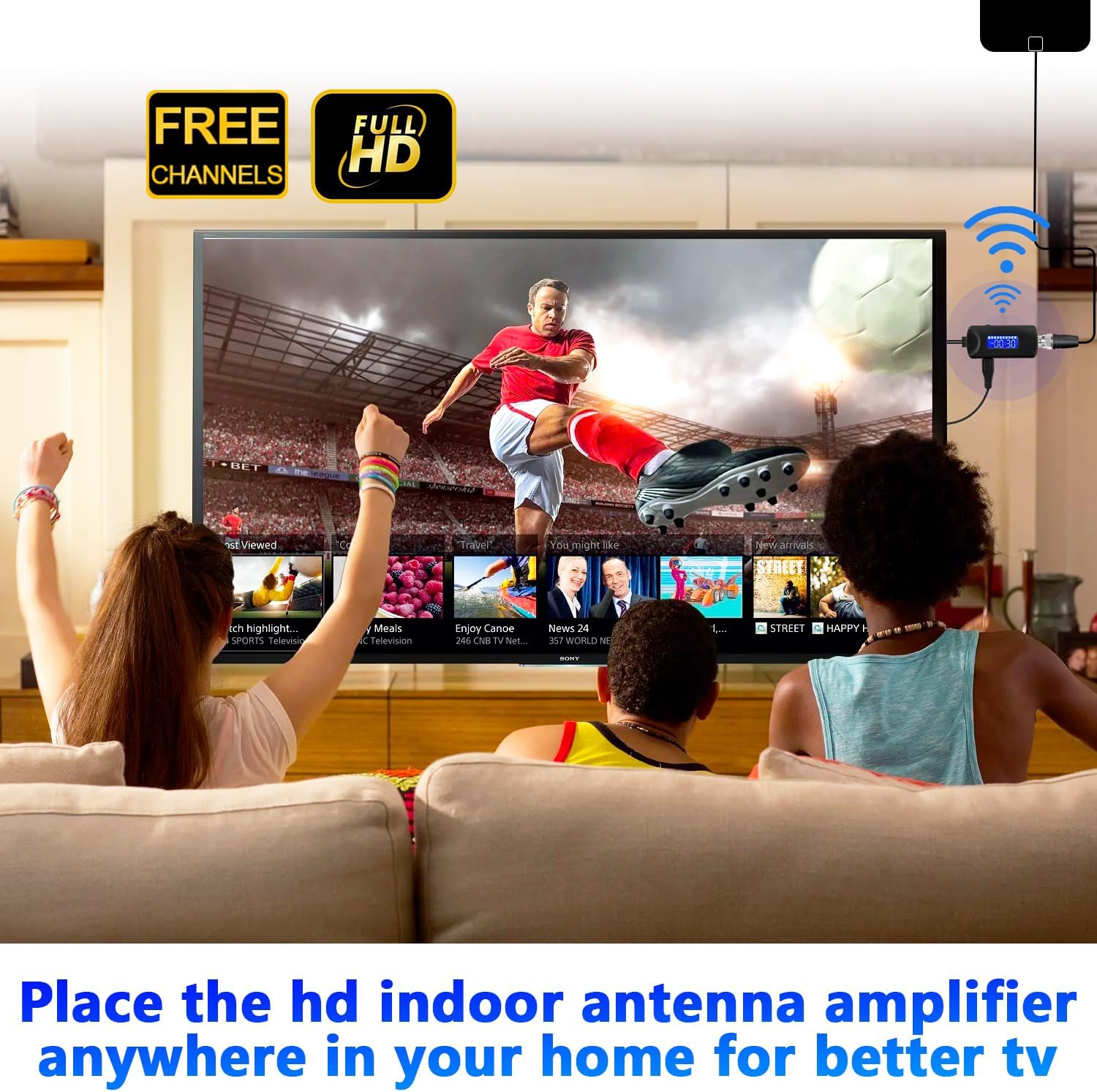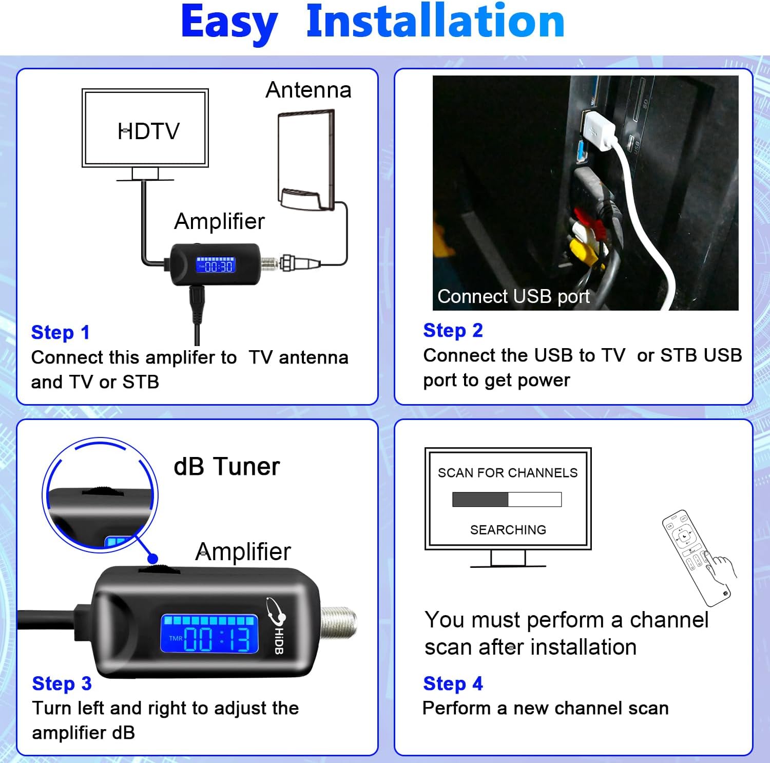 Ea𝘀𝘆 I𝗻𝘀𝘁a𝗹𝗹a𝘁𝗶𝗼𝗻: Just connect the amplifier to the antenna and TV or STB box, then plug into the USB port for getting power, HD digital TV antenna amplifier works with any non-amplified indoor tv antennas. The number of channels reception will vary depending on your surroundings and how far away you are from broadcast towers
