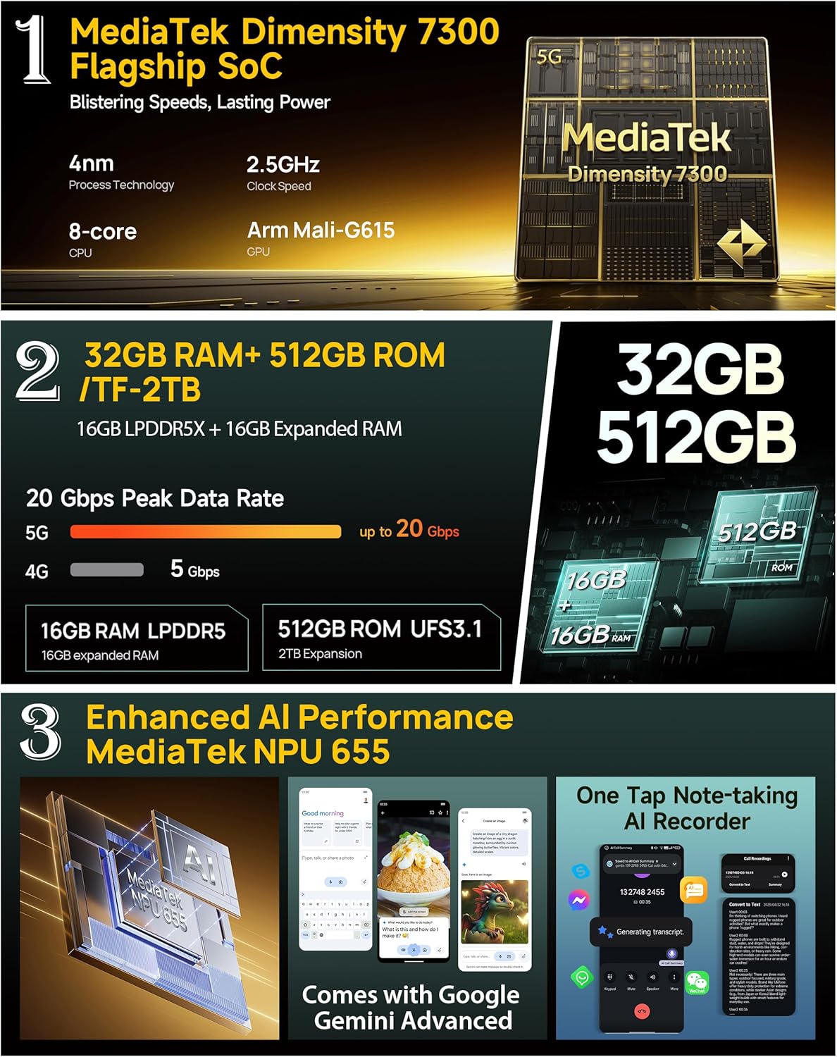 【32GB+512GB ROM & Dimensity 7300 & Android 15】With 32GB RAM (16GB +16GB adjustable RAM), 512GB of internal storage, and expandable up to 2TB spares a large room to store apps, photos, videos, and files. Mediatek Dimensity 7300 and MediaTek NPU 655 enhanced Al performance.