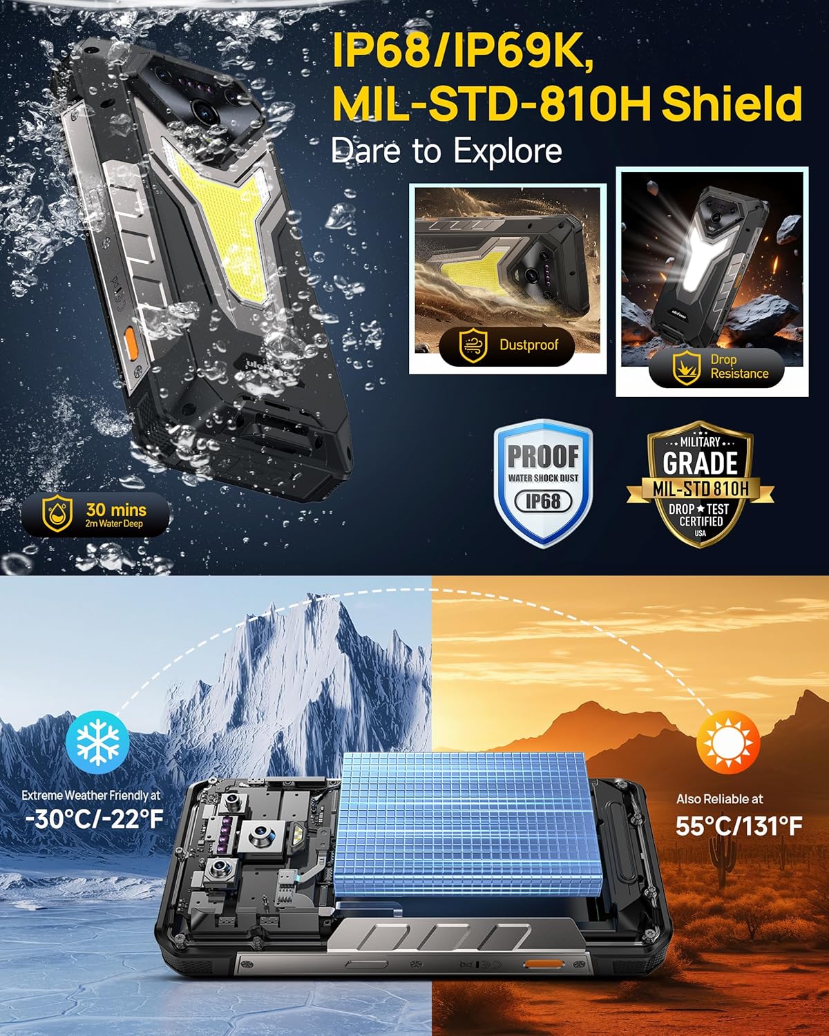 【6.95 inch FHD+ 120Hz & Ruggedness & Waterproof】With the ultra-large 6.95" Corning Gorilla Glass 5 screen, 120Hz high refresh rate makes ultra-smooth motion. Certified by MIL-STD-810H, it withstands drops, shocks and the toughest conditions with ease.