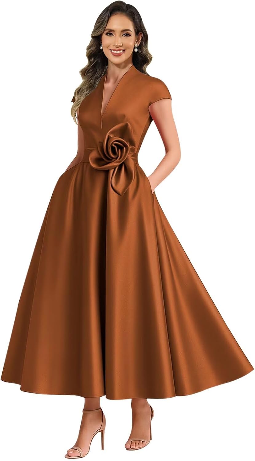Tea Length Satin Mother of The Bride Dresses for Women V Neck A Line Formal Evening Dresses with Cap Sleeves