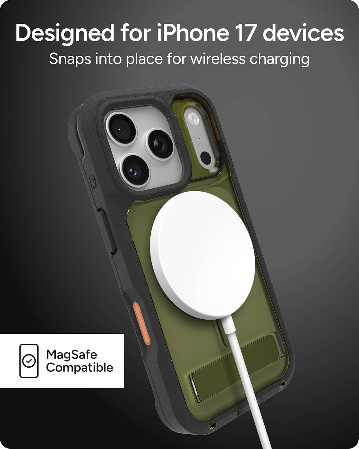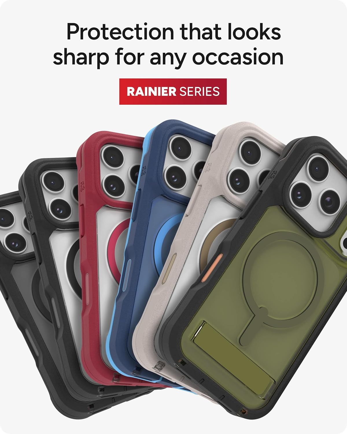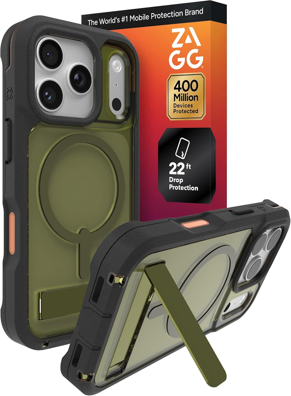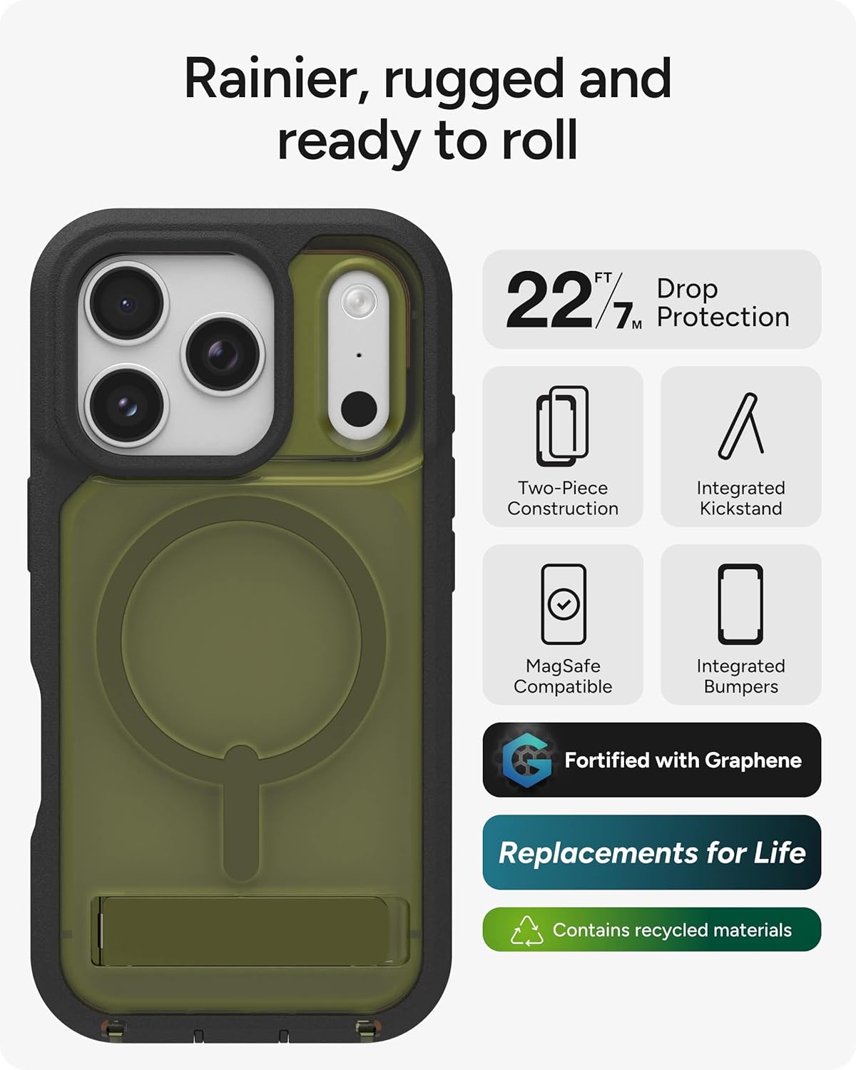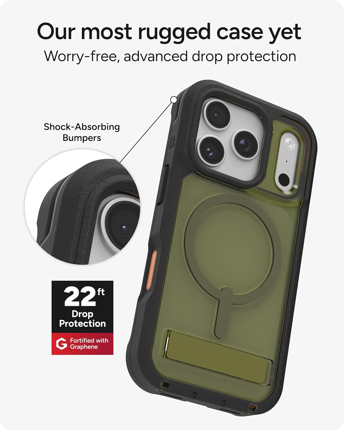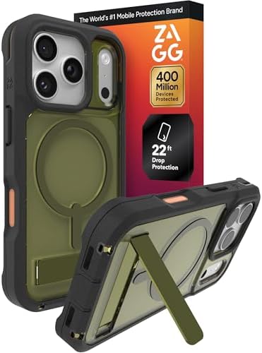MULTI-LAYER PROTECTION - The ZAGG Rainier Phone Case for iPhone 17 Pro is fortified with Graphene, a two-piece snap-on frame, and reinforced corner bumpers for extreme impact protection, with drop resistance up to 22 ft (7 m)*. Includes kickstand