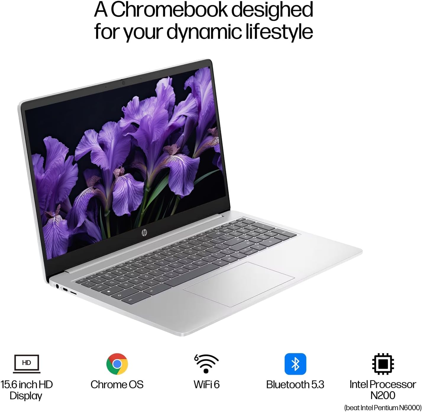 HP Chromebook 15.6" HD (Intel Processor N200, 8GB RAM, UHD Graphics), 192GB Storage (64GB eMMc + 128GB External SSD) Home & Student Laptop + 6-in-1 USB Hub - Anti-Glare, Webcam, Wi-Fi 6, Chrome OS