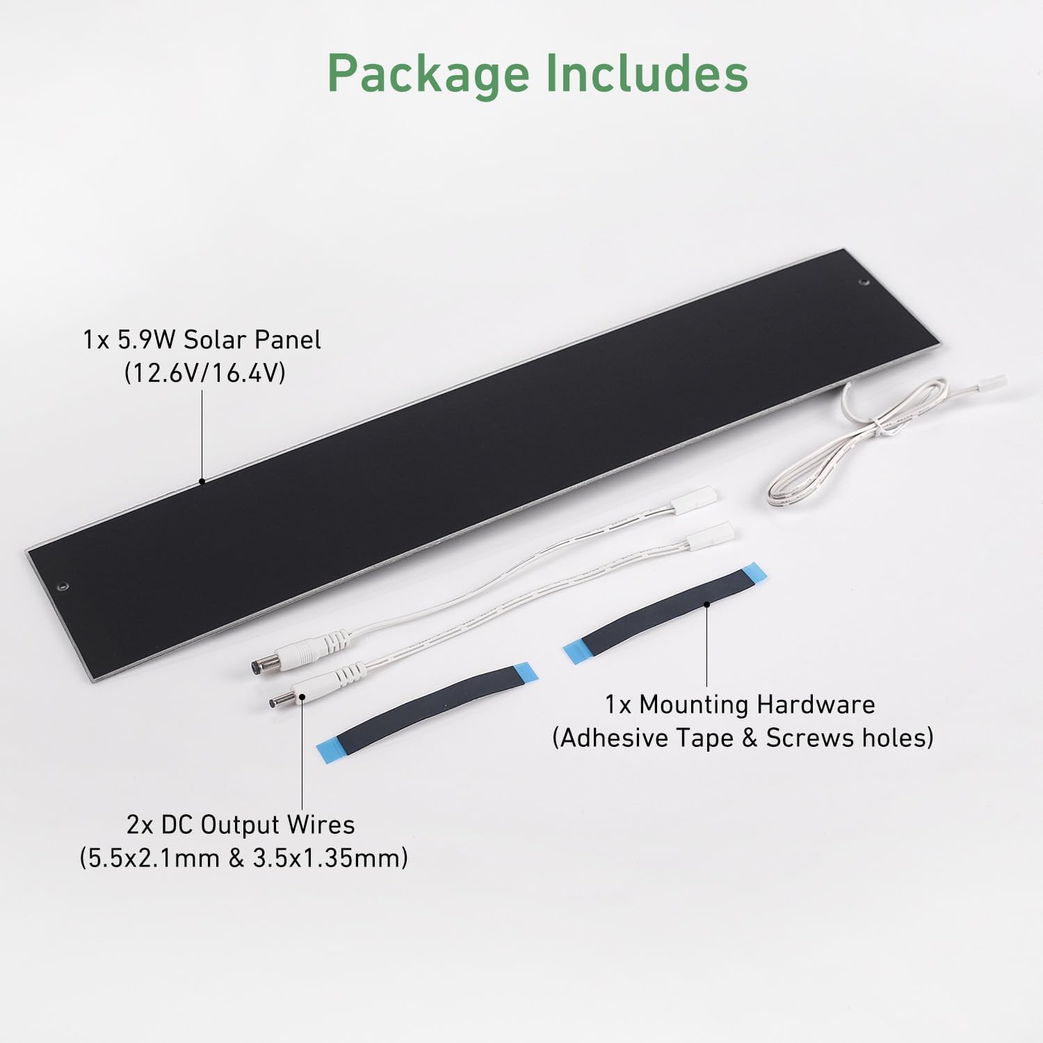 Package Includes: 1x 5.9W Solar Panel (12.6V/16.4V) 2x DC Output Wires (5.5x2.1mm & 3.5x1.35mm) 1x Mounting Hardware (Adhesive Tape & Screws holes)