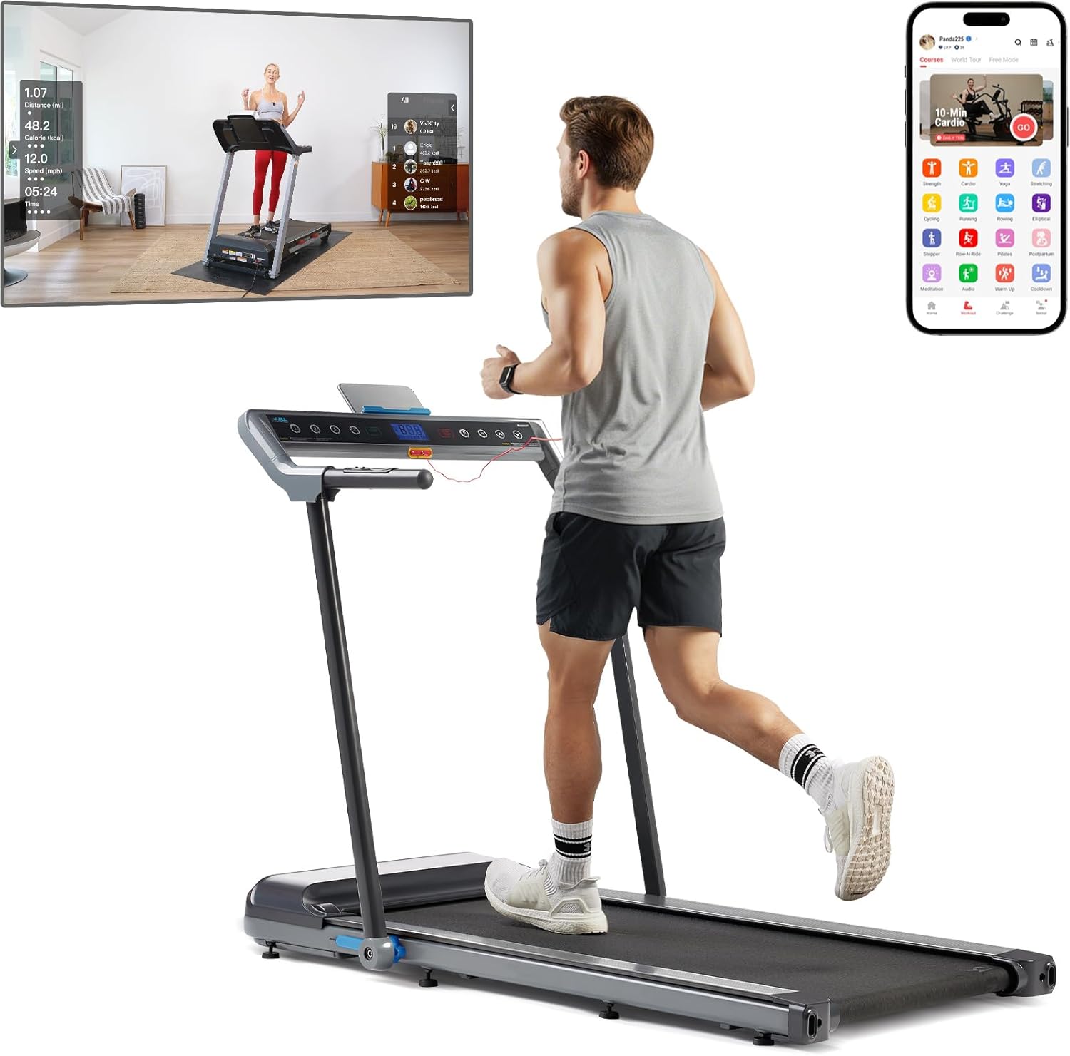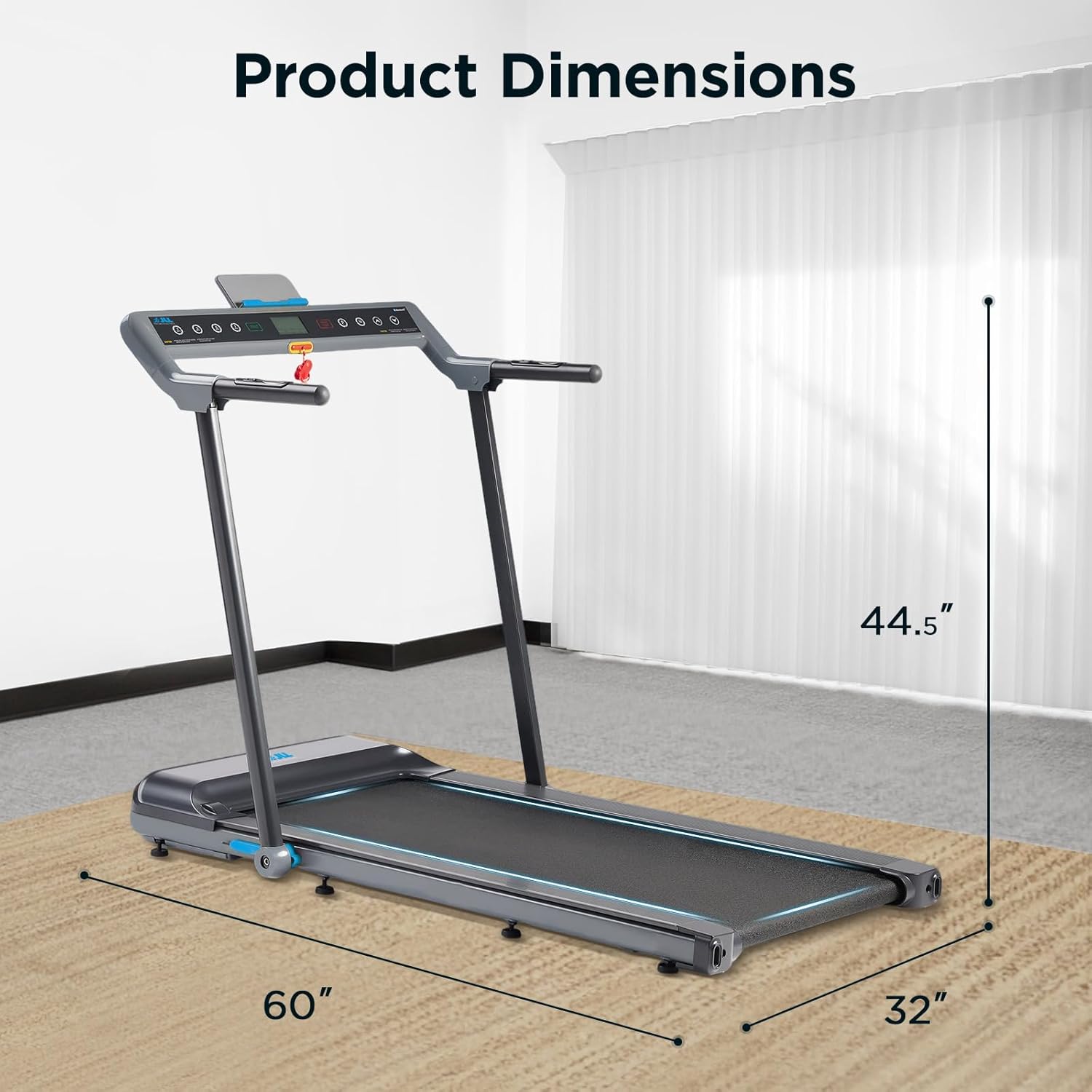 【CONVENIENT EXTRAS】A sturdy tablet/phone holder and built-in USB charging port let you watch workouts or stream your favorite music while you exercise. Adjustable leveling feet keep the treadmill stable on any surface, and the emergency safety key stops the belt instantly for added peace of mind.