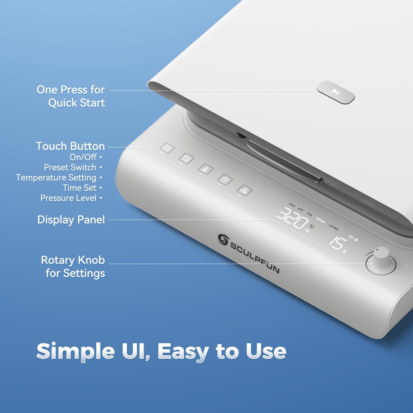 【World’s First Upward Pressure Design】Unlike traditional downward presses, the SCULPFUN H1 auto heat press machine innovative heat press features an upward clamping structure that lifts the plate from below, ensuring even pressure distribution from bottom to top.This is ideal for DTF materials, HTV, Sublimation,Vinyl and various fabric thicknesses, guaranteeing precise transfers result each time.