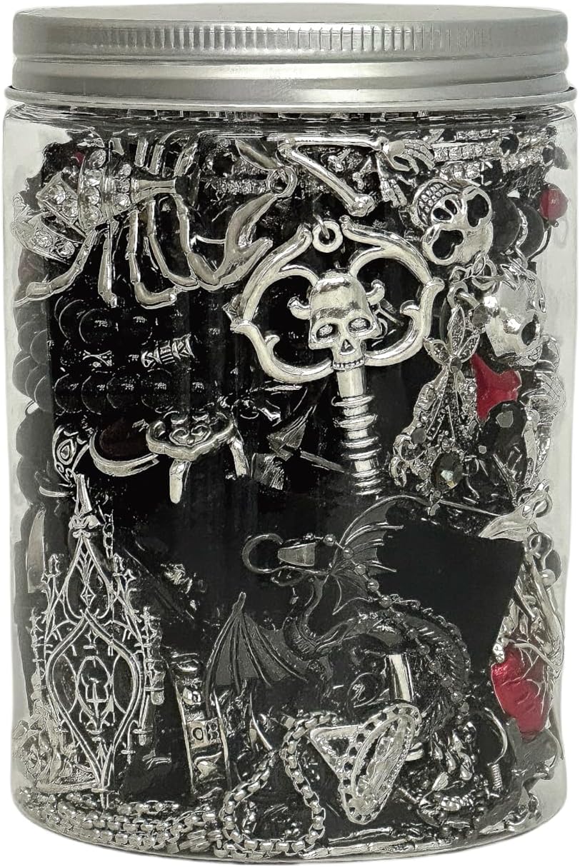 45-50 pcs Mystery Jewelry Jar, Surprise Gothic Jewelry Set for Woman, includes Gothic Punk Witch Necklaces, Earrings, Rings, Bracelets and Hair Clips, Unique Goth Jewelry Box Gift for Her