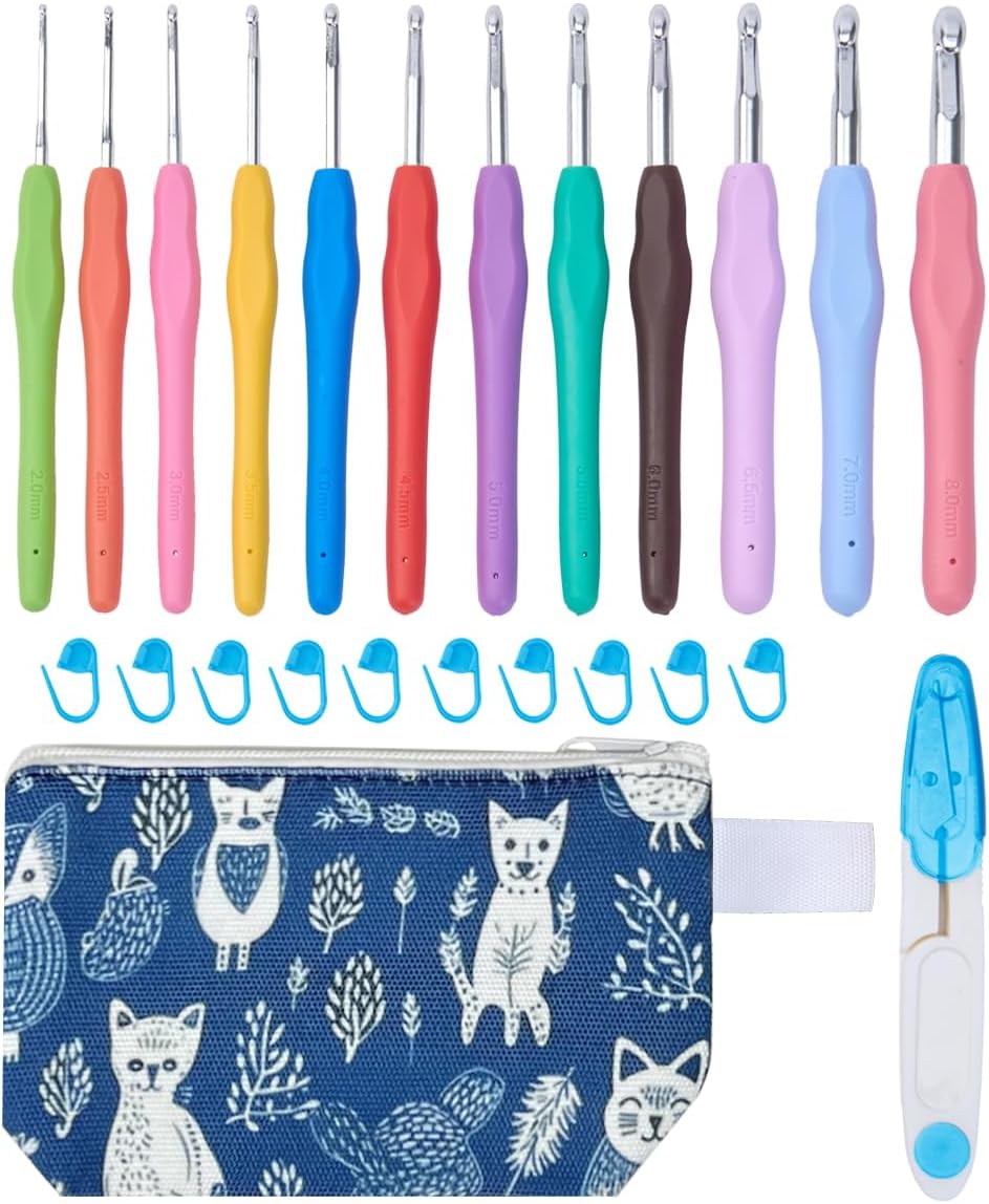 LeCorner Crochet Hooks, 12 Sizes Ergonomic Crochet Hook Set, 2mm-8mm Soft Grip Crocheting Needles Kit for Beginners Arthritic Hands with Knitting Accessories Stroage Bag