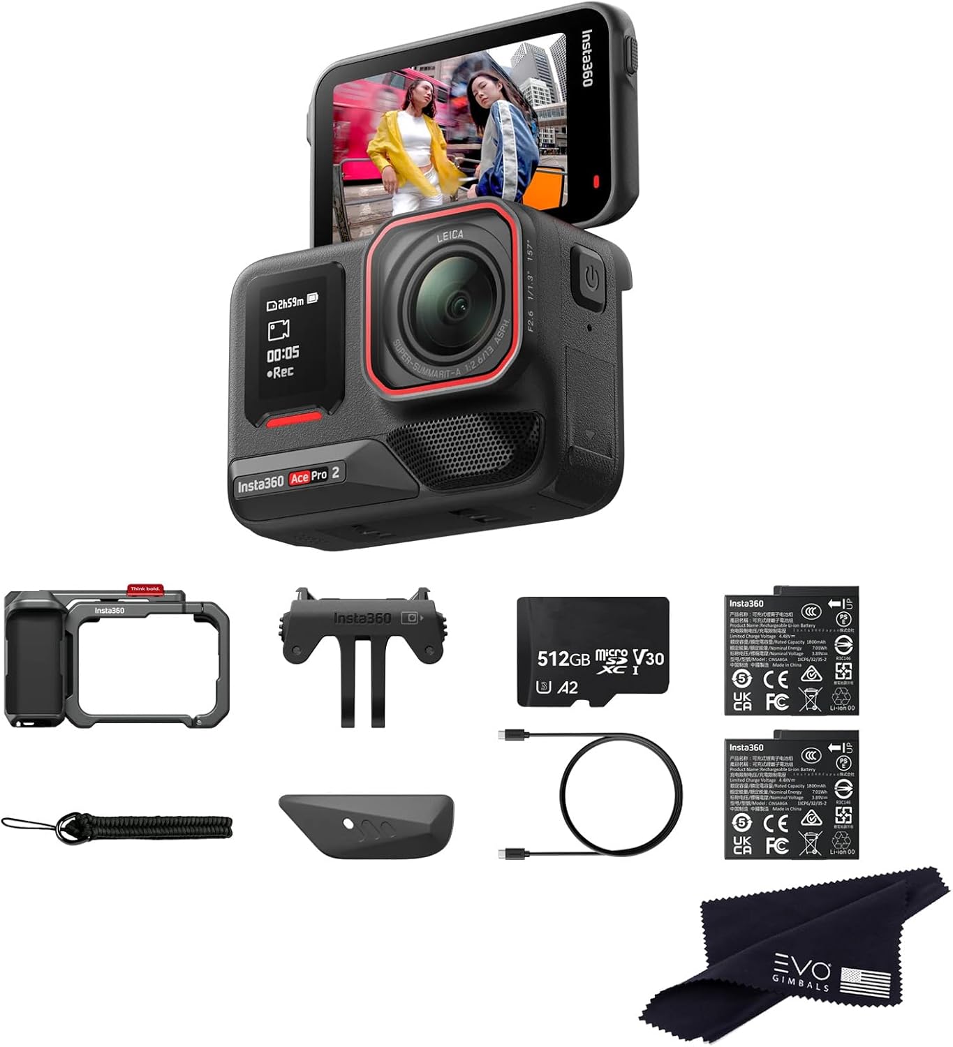Insta360 Ace Pro 2 Dual Battery Xplorer Bundle with 512GB Card- 8K Waterproof Action Camera Co-Engineered with Leica, Flagship 1/1.3" Sensor, 8K30fps, 4K60fps, 2.5" Flip Screen, AI Noise Reduction
