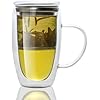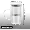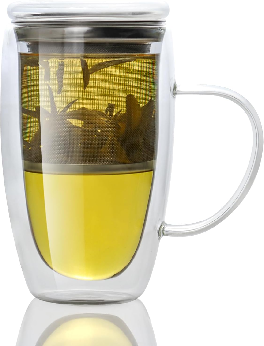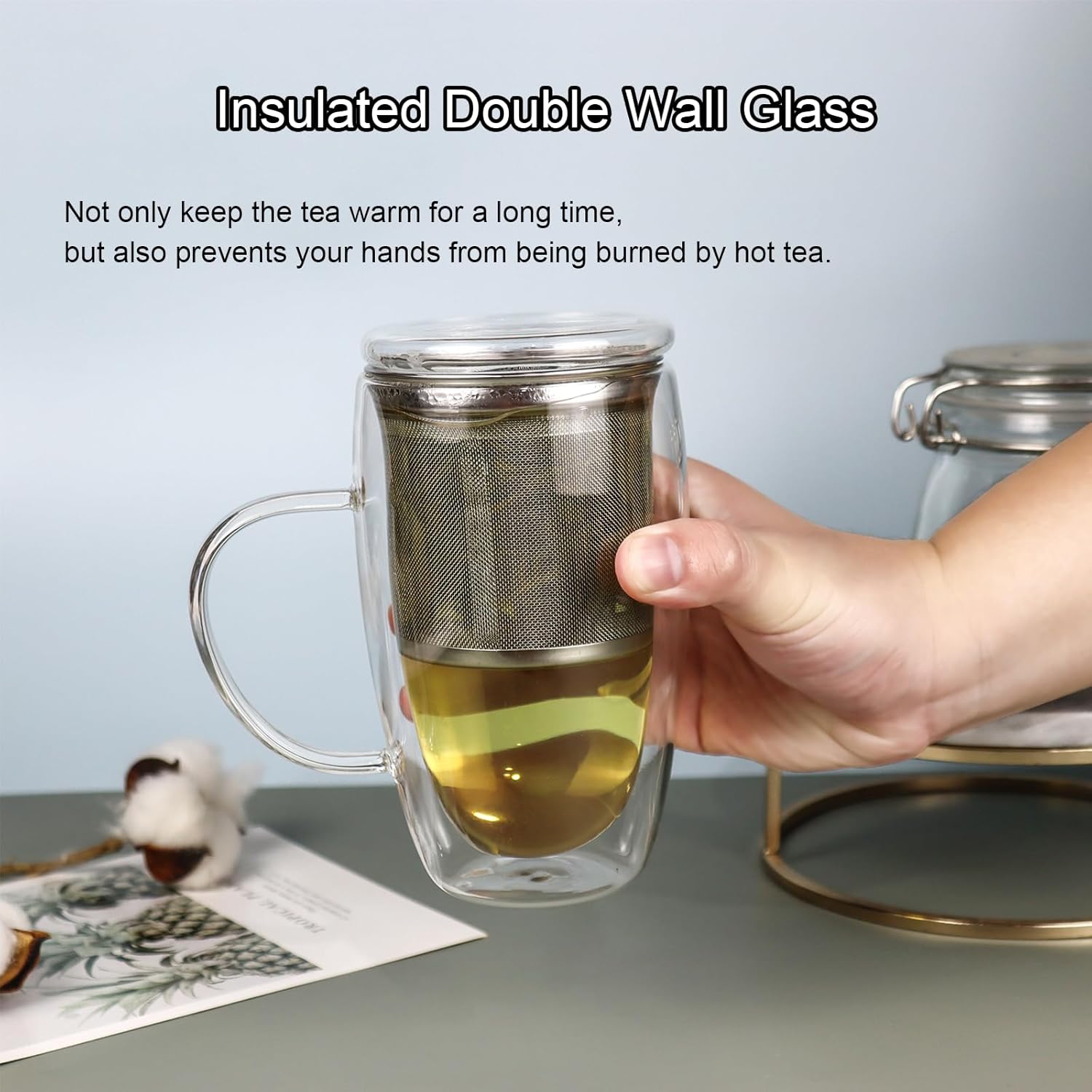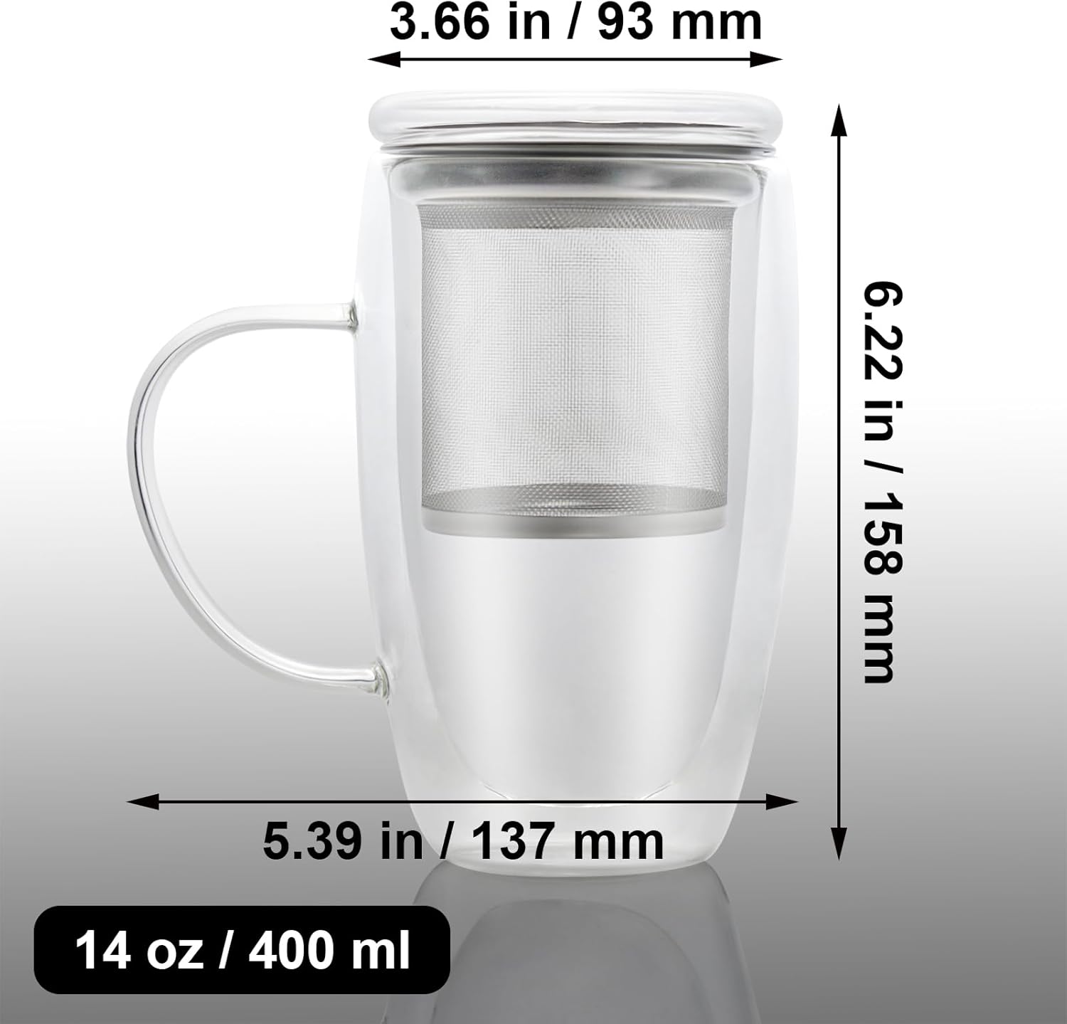 Double Wall Glass Tea Mug with Infuser and Lid, 14 oz / 400 ml Borosilicate Glass Tea Cup with 304 Stainless Steel Fine Mesh Infuser, Durable Insulated Tea Cup, Dishwasher Safe, Gift for Tea Lovers