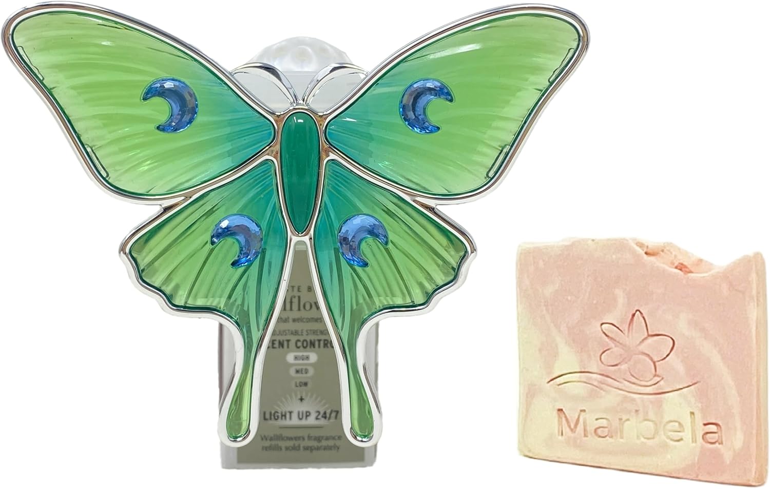 Bath & Body Works Luna Moth Adjustable Wallflowers Scent Control Fragrance Plug with a Marbela Himalayan Salts Springs Sample Soap (Ingredients: Saponified Oils of: Olive Oil, Organic Virgin Coconut Oil, Shea Butter, Castor Oil, Himalayan Salts, Kaolin Clay, Fragrance, Vitamin E, Mica, Litsea Cubeba Essential Oil, Titanium Dioxide, Sodium Lactate).