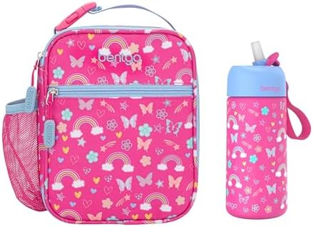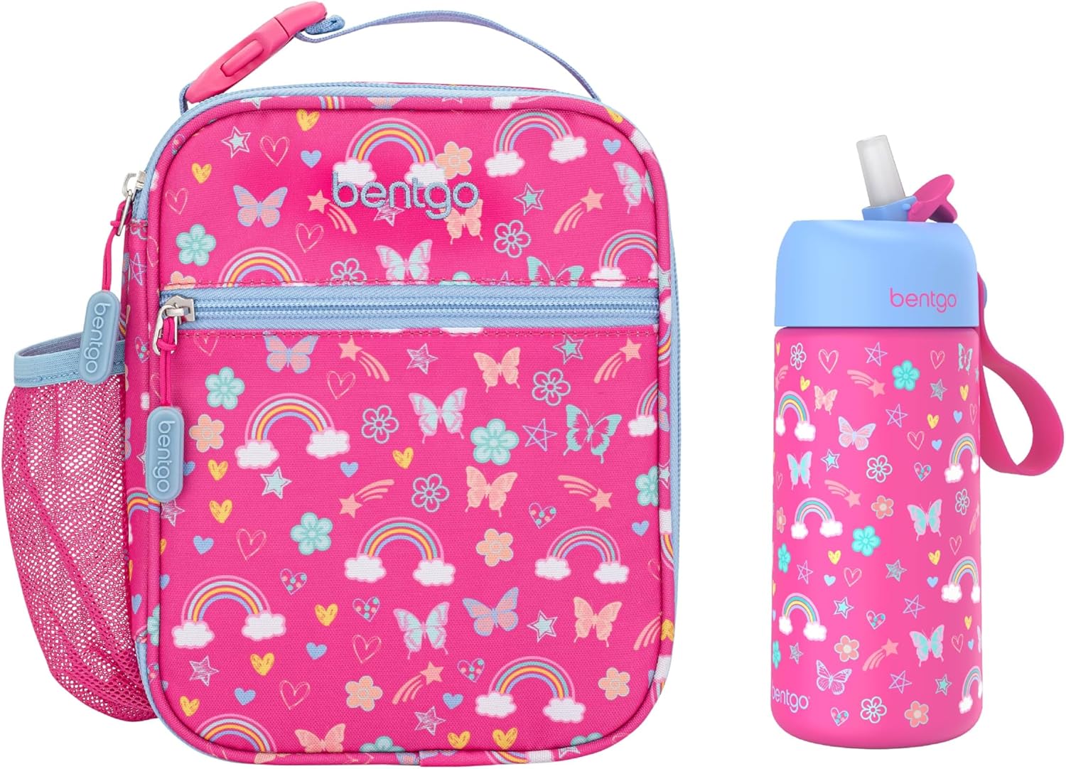 Bentgo Prints Insulated Lunch Tote Set With Kids Stainless Steel Water Bottle (Rainbows & Butterflies)