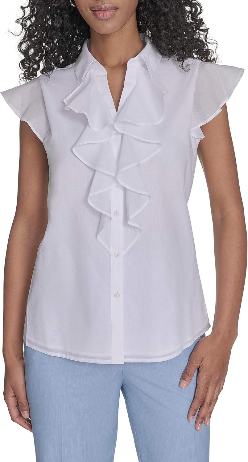 This Calvin Klein Women's Suits Woven Top is a Flutter Sleeve Collared Solid