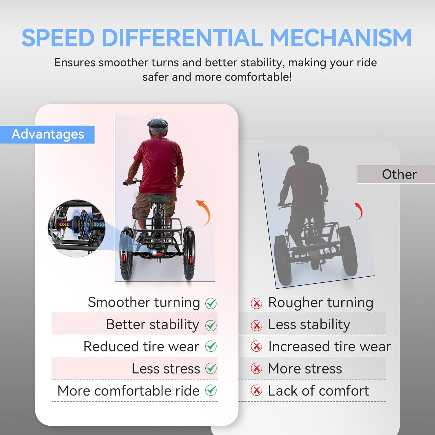 【Enhanced Safety & Comfort】 – Premium features include mechanical disc braking system with parking function, seat tube shock absorption, plus a sturdy frame rated for 285LBS rider weight and 150LBS rear storage.