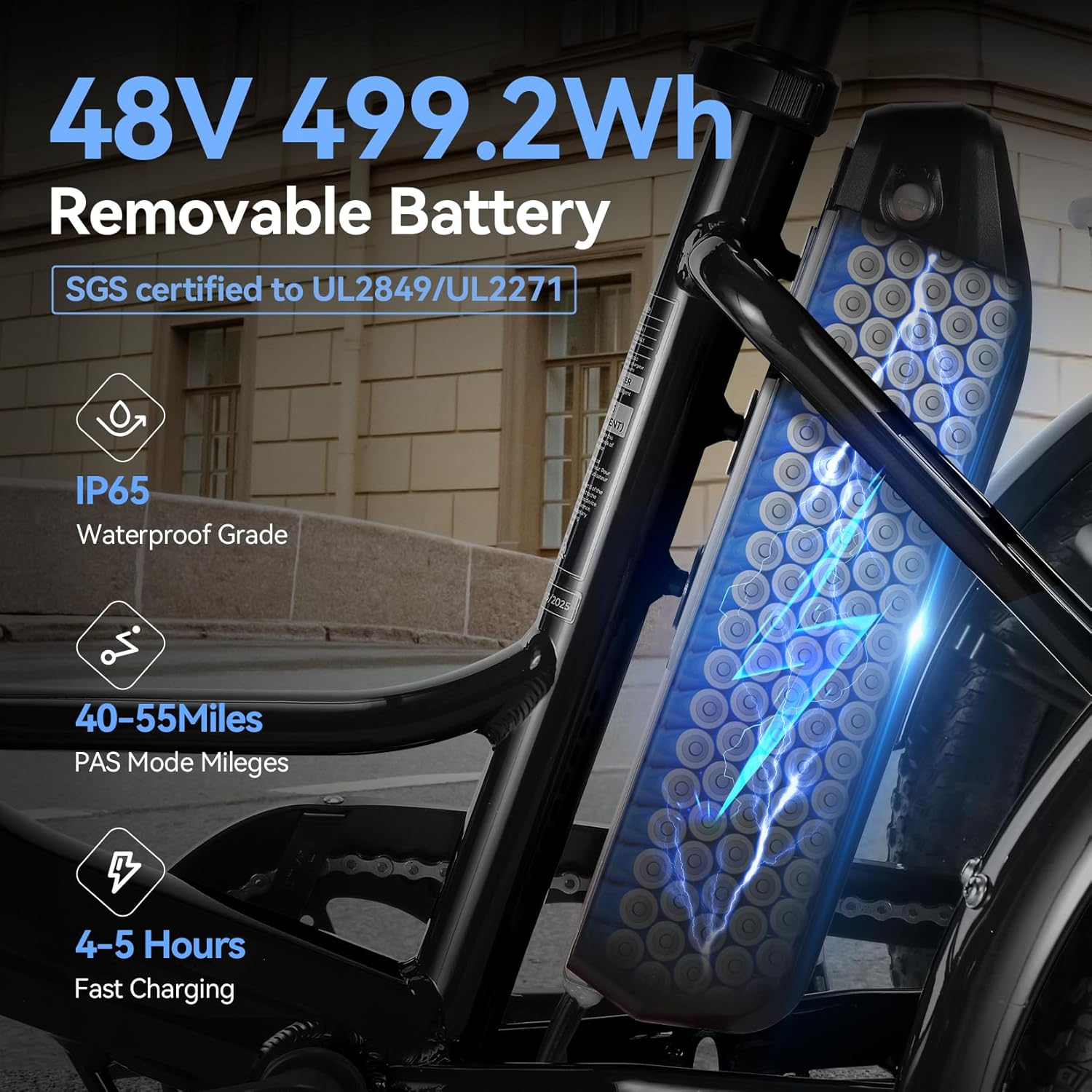 【Quality Certified】-SGS certified to UL2849/SGS certified to UL2271, our battery system meets the highest safety requirements for electric mobility devices. The IP65 waterproof rating ensures excellent protection against dust and water splashes, allowing you to ride confidently in various weather conditions.