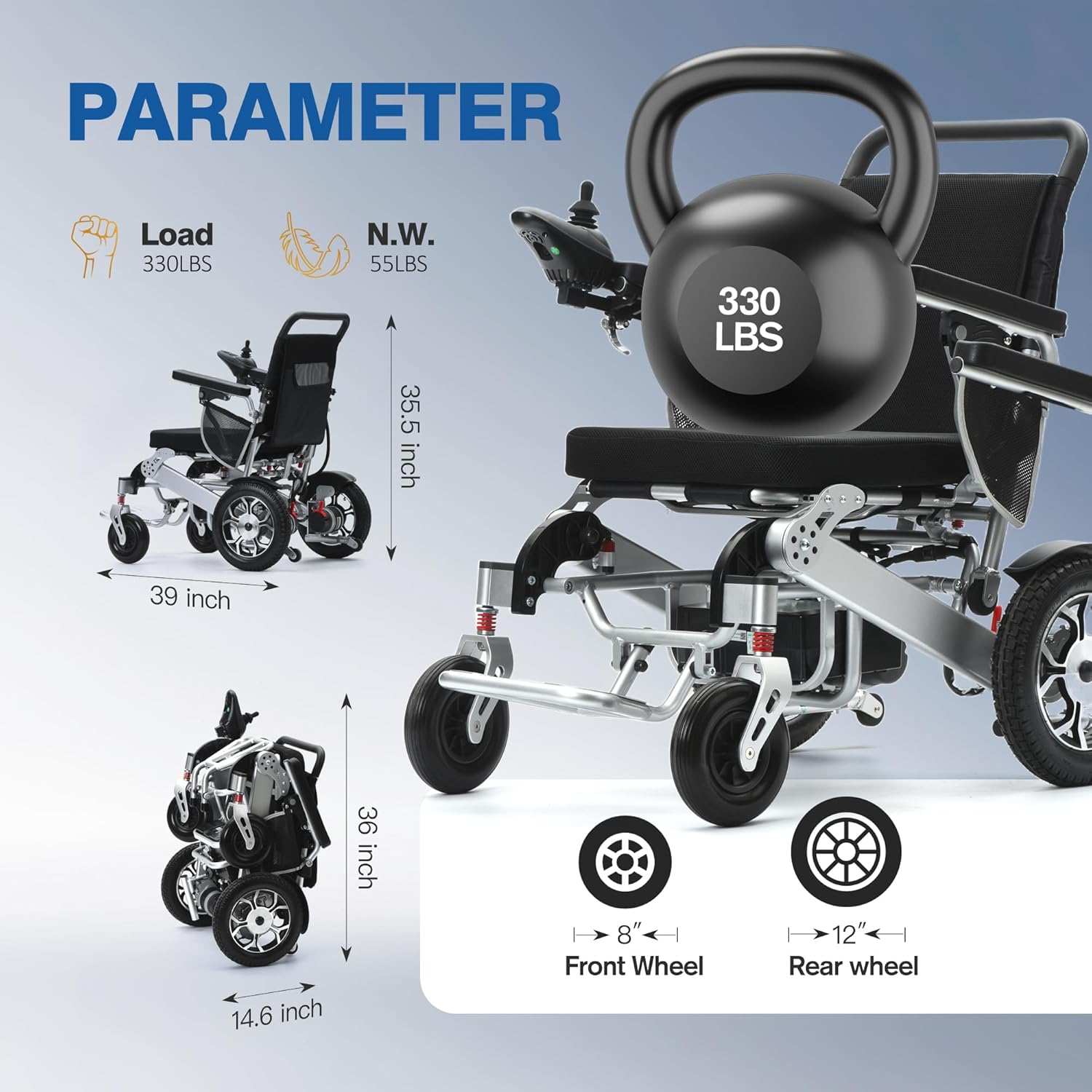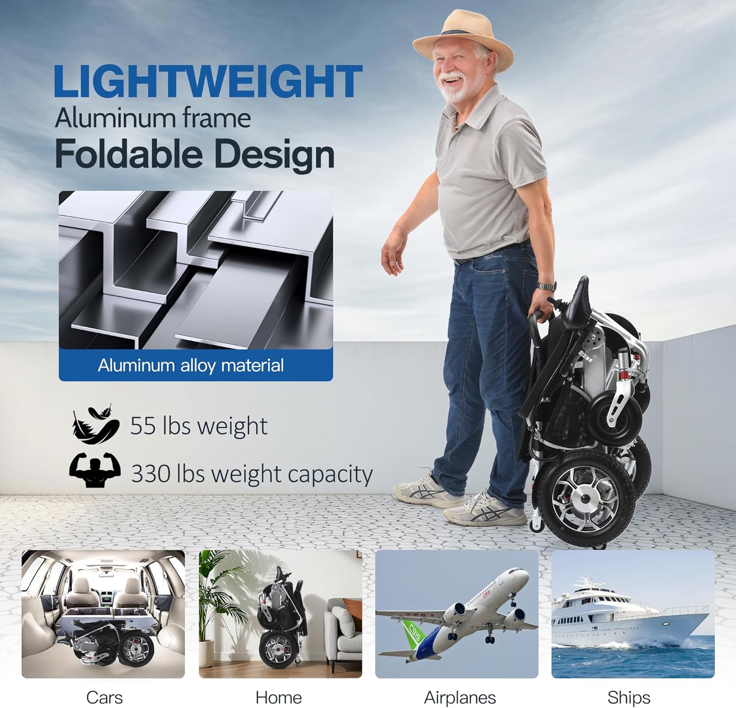 Lightweight Yet Heavy-Duty: Weighing only 62 lbs with a 330 lb weight capacity, this portable electric wheelchair is both ultra-light and robust. Folds down to 30 inches tall—ideal for car trunks and tight storage areas.