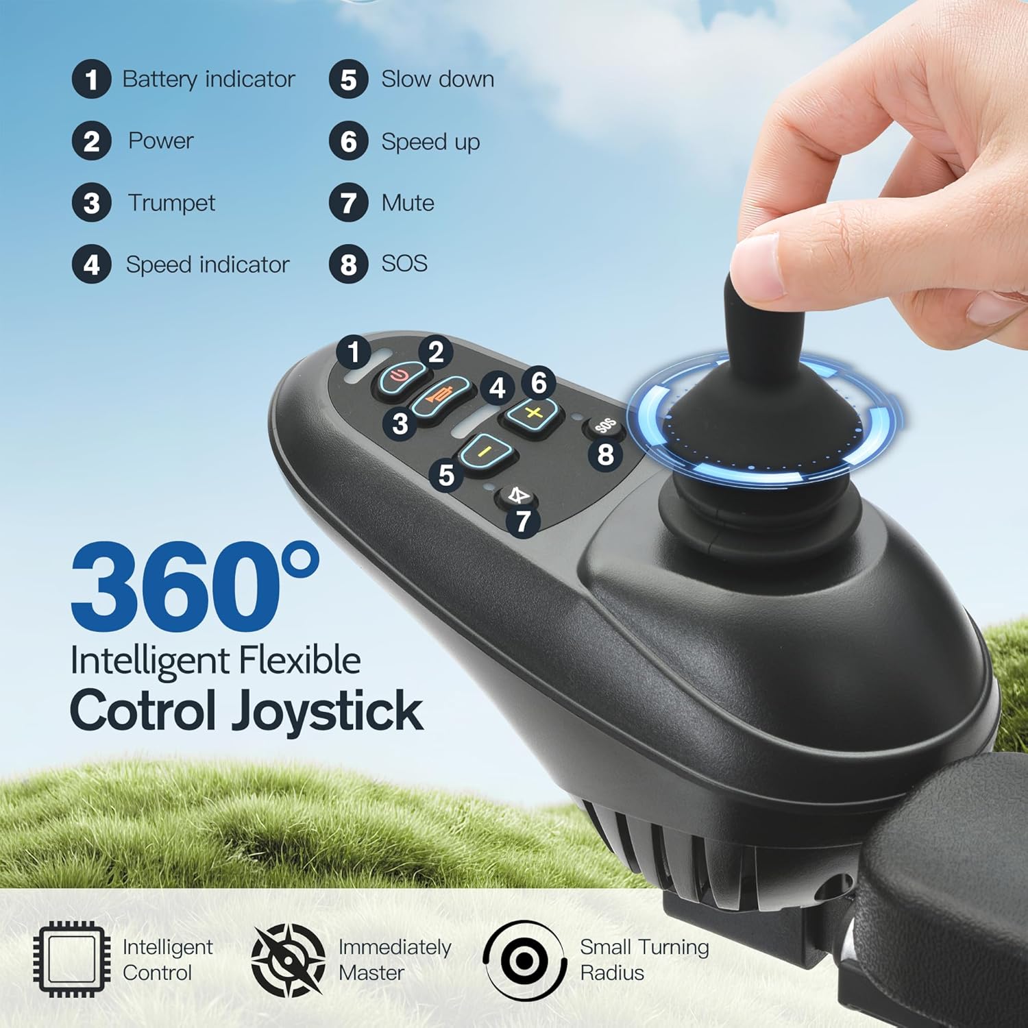 Easy to Operate & Adjustable: Features a 360° rotatable joystick with 5-speed settings for precise control in narrow spaces. You can switch the manual & electric mode via the red button on both of the wheels , easy to operate and meet your various daily needs.