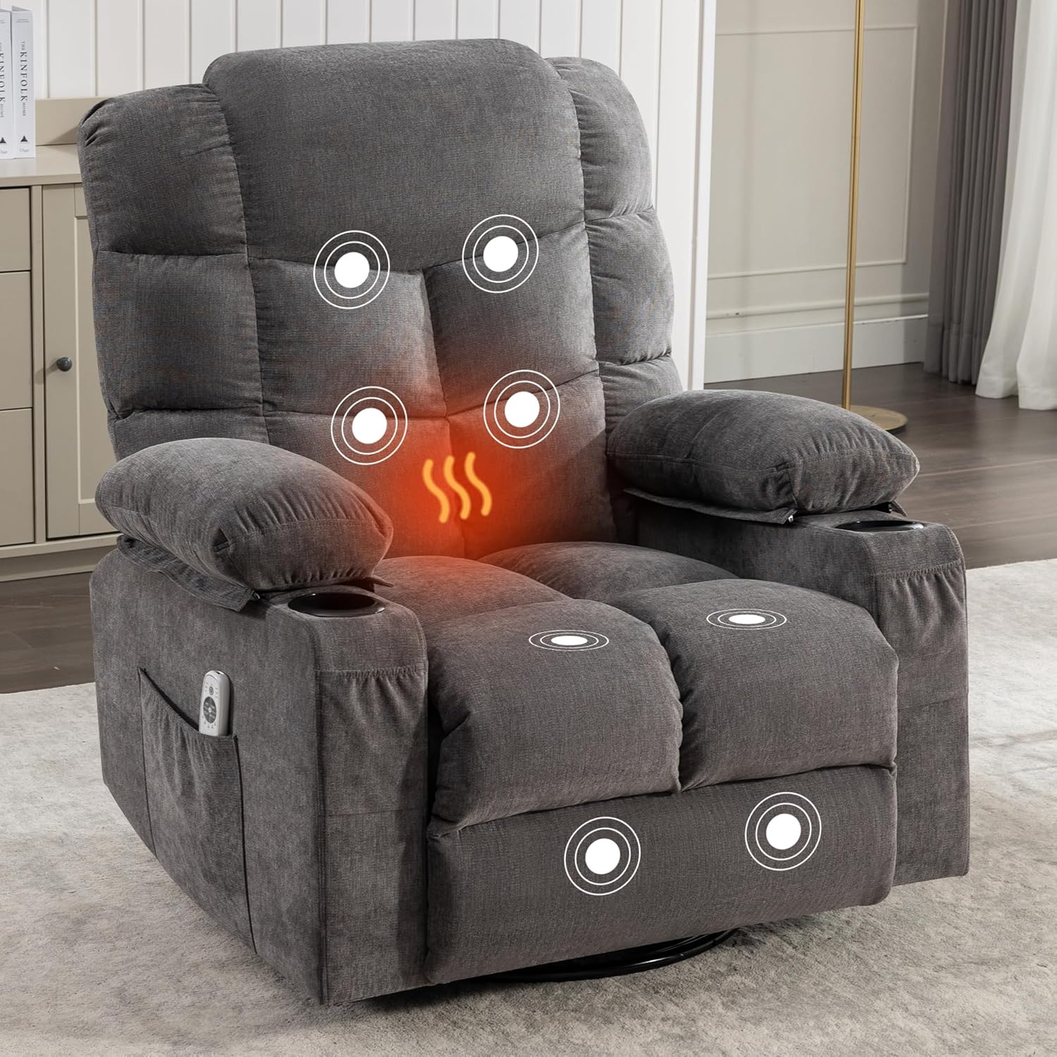 Oversized Massage Swivel Recliner Chair with Lumbar Heating for Living Room Rocker Recliner Single Sofa with Cup Holders and USB Charge Port, Large Big Chair Recliners for Adult