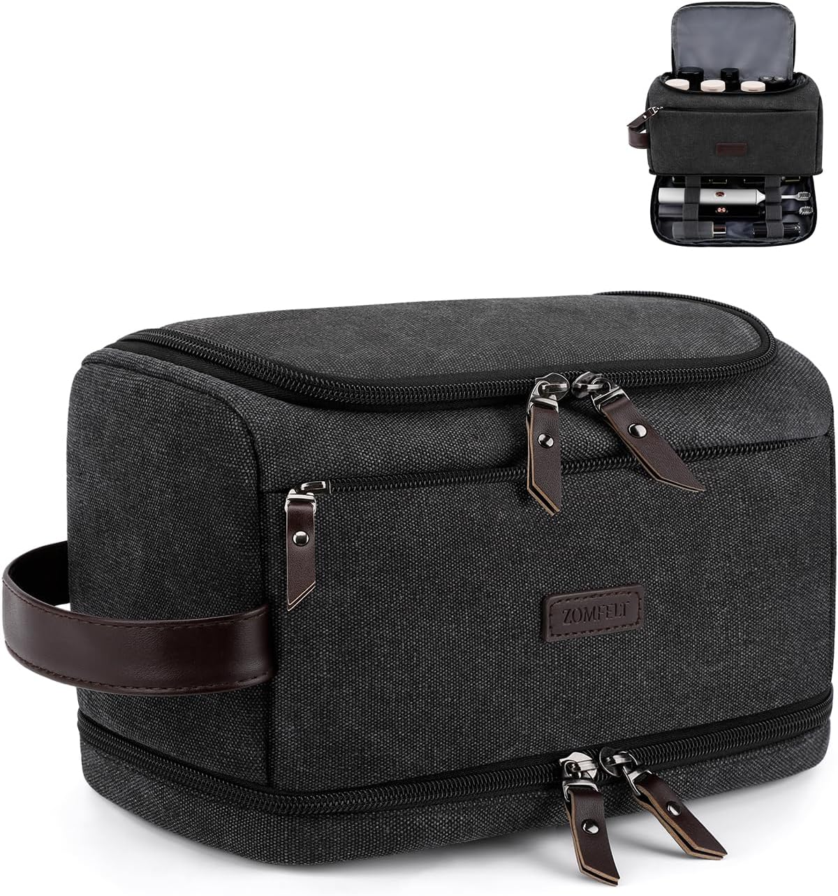 ZOMFELT Toiletry Bag for Men, Dual Layers Canvas Travel Toiletries Bag, Water-Resistant Travel Organizer with Elastic, Large Capacity Dopp Kit, Hanging Shaving Hygiene Bag, Black