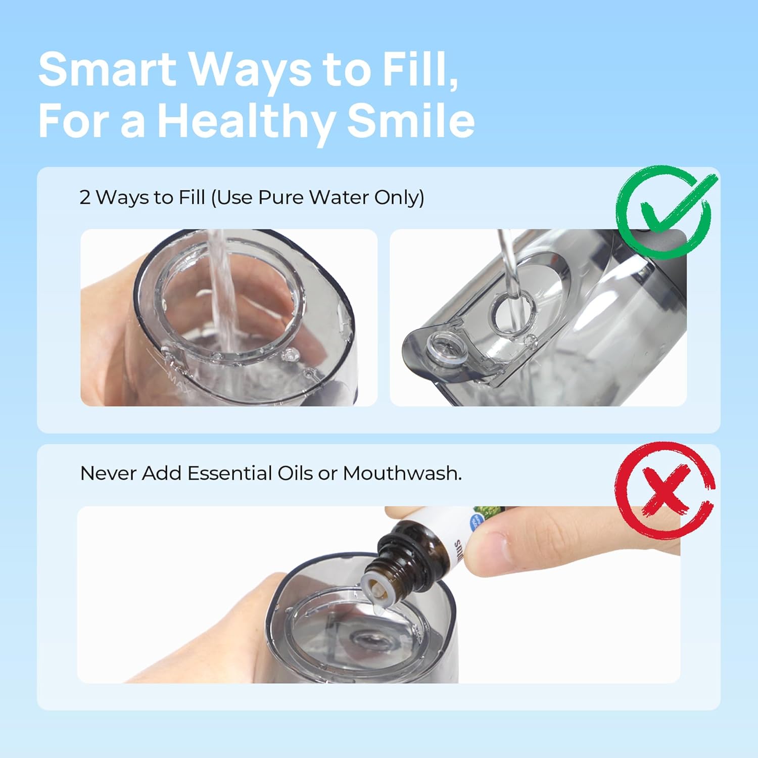 Please observe these precautions for optimal use of your water flosser: Avoid essential oils to prevent clogging, internal damage, and corrosion of the water main board; partially close your mouth during use to minimize splashing; and always ensure the charging port cover is fully sealed to maintain water resistance and avoid charging malfunctions or reduced charging speed