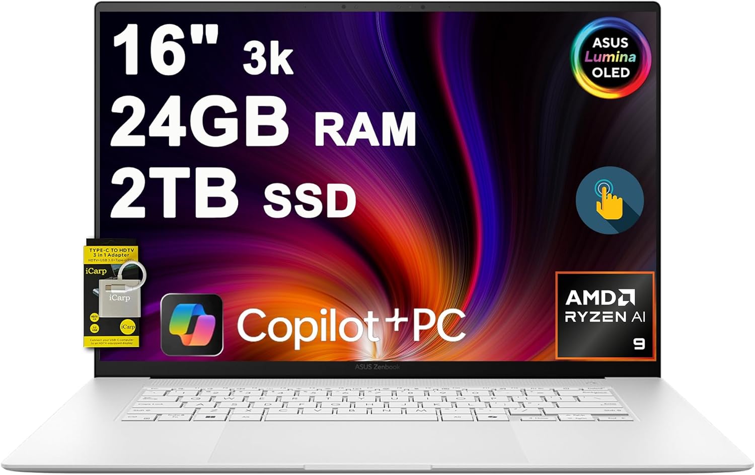 ASUS Zenbook S 16 Laptop 16" 3k OLED 120Hz Touch (100% DCI-P3, 500nits HDR) AMD 10-core Ryzen AI 9 365 (Up to 50 Tops) 24GB RAM 2TB SSD for Creator Business Professional Win11 ICP Hub w/Copilot+ AI