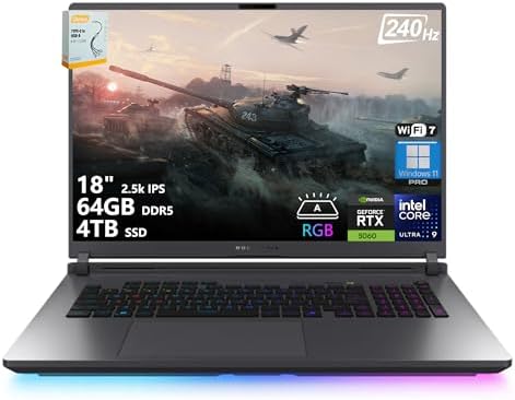 KEY SPECIFICATIONS: PC Type: Gaming Laptop Computer PC Series: ASUS ROG Strix G18 Processor: Intel Core Ultra 9 Processor 275HX 2.7 GHz (36MB Cache, up to 5.4 GHz, 24 cores, 24 Threads); Intel AI Boost NPU up to 13TOPS Memory: 64GB DDR5 Storage: 4TB SSD Graphics: NVIDIA GeForce RTX 5060 Laptop GPU 8GB GDDR7 Display: 18" 2.5K (2560 x 1600, WQXGA) 16:10 aspect ratio, 500nits, 240Hz/3ms IPS-level, 100% DCI-P3, Anti-glare Nebula Display Communications: Wi-Fi 7 + Bluetooth 5.4 Camera: 1080P FHD IR Camera Audio: Dolby Atmos, Smart Amp Technology Keyboard: 4-Zone RGB Backlit Keyboard Operating system: Windows 11 Professional Ports & Slots: 1x 3.5mm Combo Audio Jack, 1x HDMI 2.1 FRL, 1x USB-C 3.2 Gen 2 support DisplayPort / power delivery / G-SYNC, 1x Thunderbolt 4 support DisplayPort / power delivery, 3x USB-A 3.2 Gen 2, 1x RJ45 Additional Information: Dimensions: 15.71" x 11.73" x 0.93" ~ 1.26" Approximate Weight: 7.05 pounds