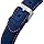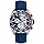 Stainless steel case with a blue leather strap. Fixed stainless steel bezel with a blue aluminium ring showing tachymeter markings. Blue/aqua/orange dial with luminous silver-tone hands and index hour markers. An Arabic numeral appears at the 12 o'clock position. Minute markers around the outer rim. Dial Type: Analog. Luminescent hands and markers. Date display at the 4 o'clock position. Chronograph - three sub-dials displaying: 60 second, 30 minute and 1/10th of a second. Scratch resistant sapphire crystal. Screw down crown. Solid case back. Round case shape. Case size: 43 mm. Band length: 7 inches. Tang clasp. Water resistant at 200 meters / 660 feet. Functions: chronograph, date, hour, minute, second. Sport watch style. Watch label: Swiss Made.