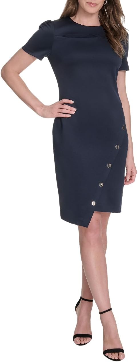 Tommy Hilfiger Women's Short Sleeve Studded Asymmetrical Hem Scuba Crepe Sheath Dress