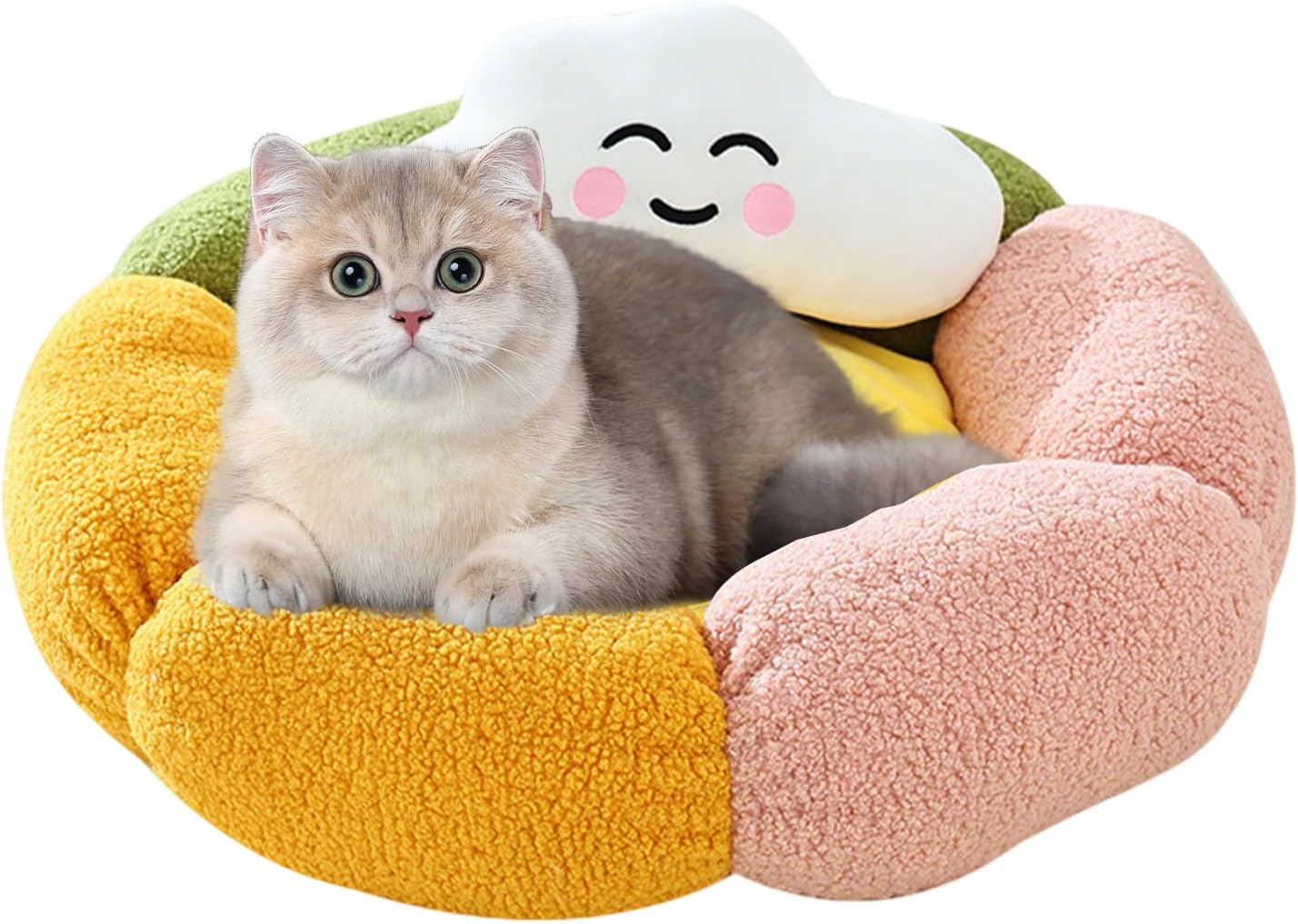 Cute Flower Cat Bed with Cloud Pillow,Calming Donut Bed for Indoor Kittens Washable Fluffy Cat Sleeping Nest Anti-Slip Bottom for Small Pet Kitten