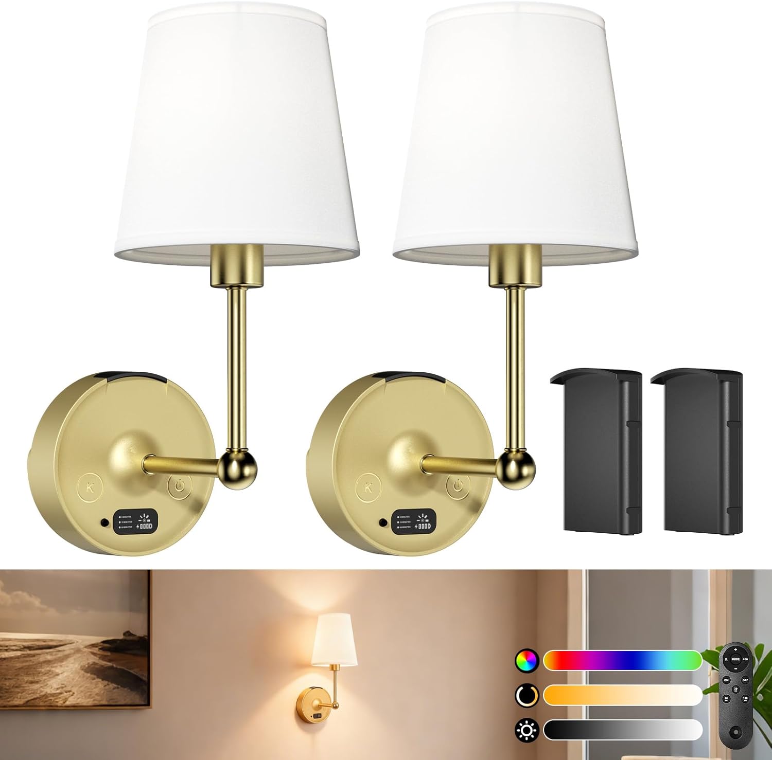 Lightbiz Battery Operated Wall Sconces Set of Two, Detachable Rechargeable Battery Wall Light RGB Dimmable Wall Lamp Lighting with Remote for Bedroom, Living Room