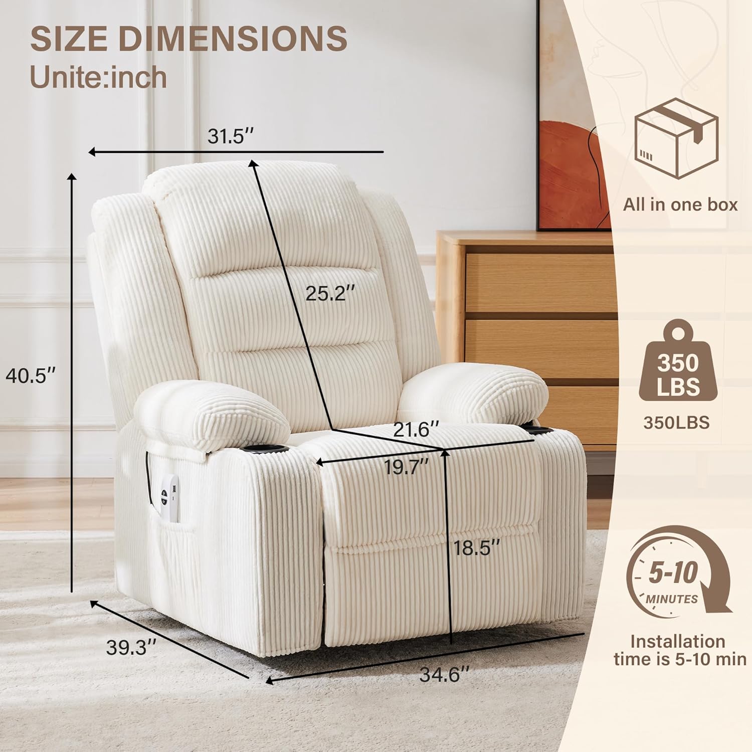 Premium Materials:electric reclining chair features thick cushions filled with high-density foam,providing an exceptional level of comfort that envelops your entire body.Its soft,skin-friendly fabric,meticulous craftsmanship,and durable metal frame ensure safety and reliability,with the capacity to support up to 350 pounds.