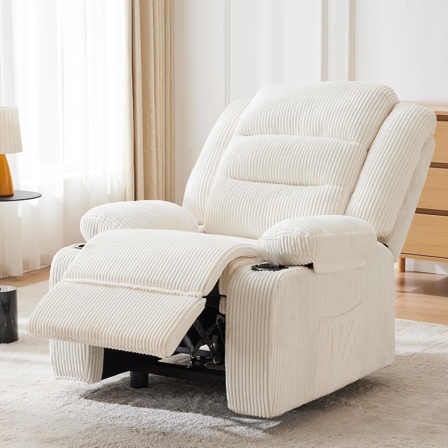 Storage Pockets and Cup Holders:Power recliner is designed with convenience in mind,featuring side pockets for easy access to small items. Additionally,cup holders on both armrests cater to all your needs,making it perfect for enjoying drinks and snacks while you unwind.
