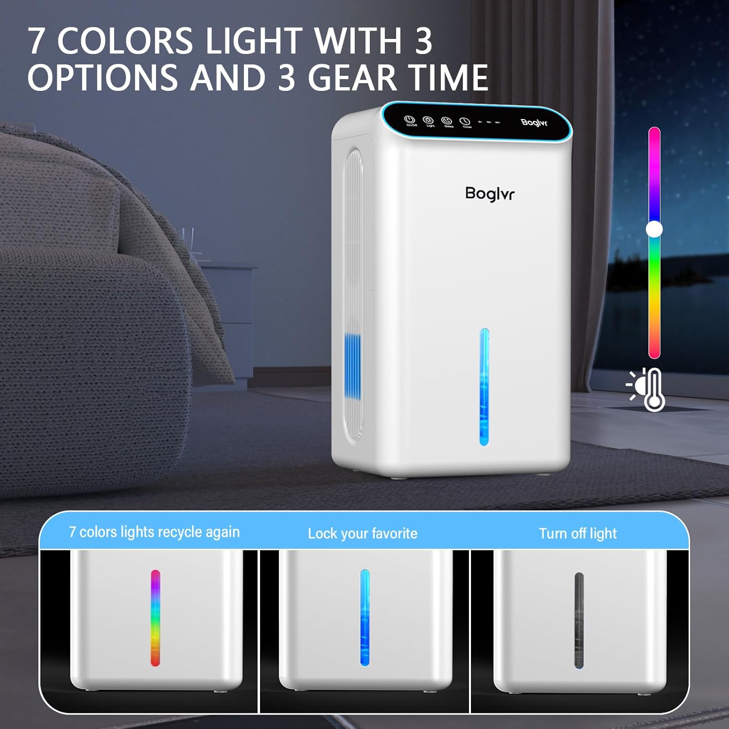 【LED Night Light with Adjustable Color Options】Featuring a 7-color LED night light, this compact dehumidifier offers flexible lighting control. Press once to cycle through colors, press again to lock your favorite color, and press a third time to turn the light off. The soft glow adds a pleasant touch to your space, making it suitable for bedrooms, nurseries, and relaxation areas.